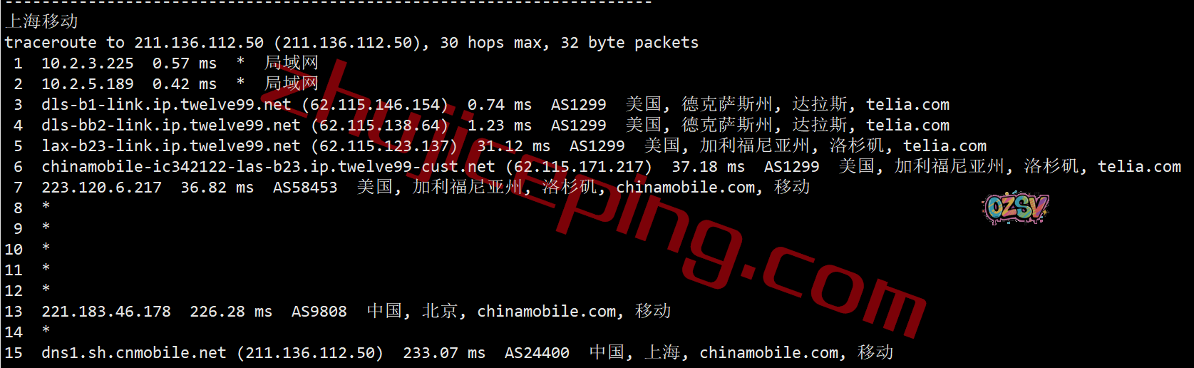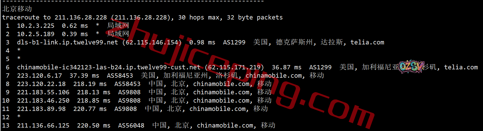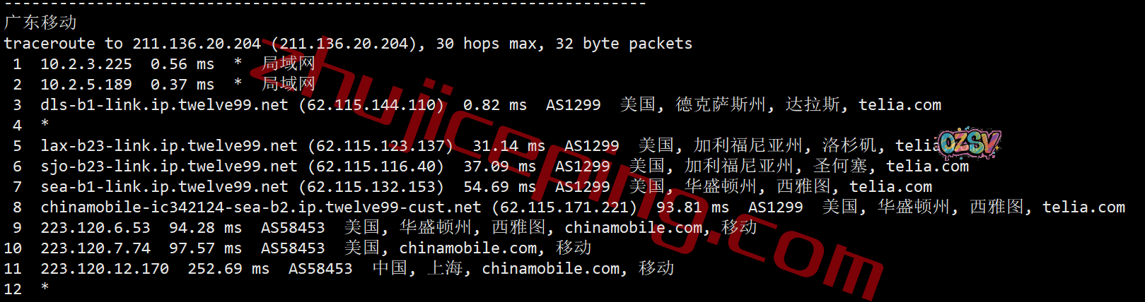 移动回程:走telia到洛杉矶或者西雅图,然后从移动洛杉矶或者西雅图节点直连回国