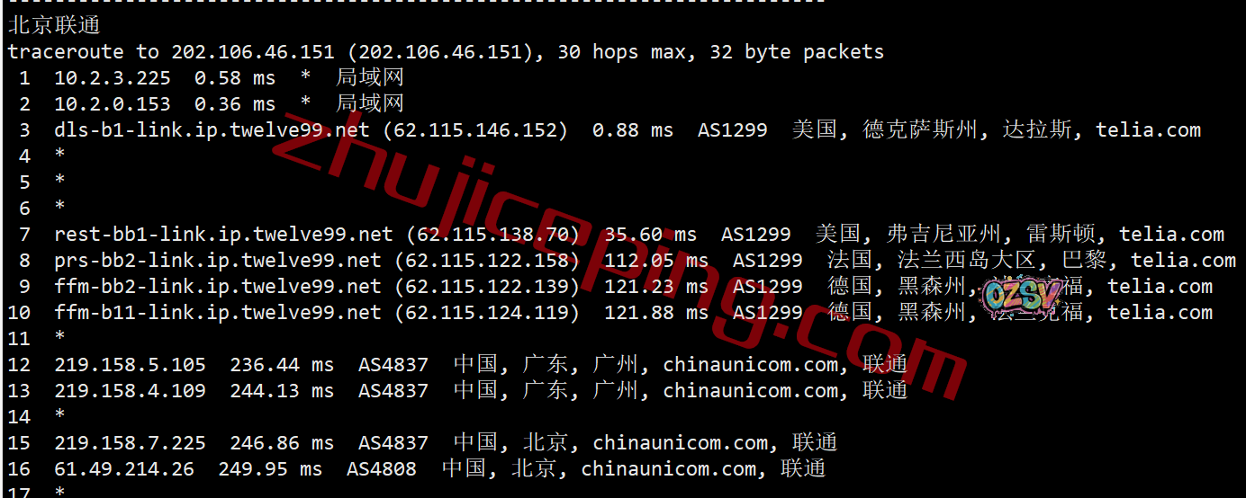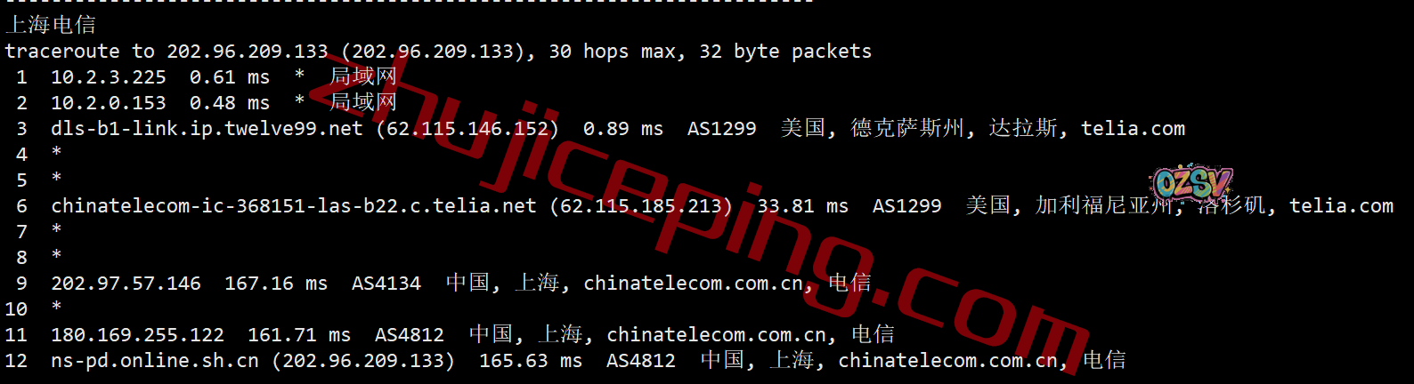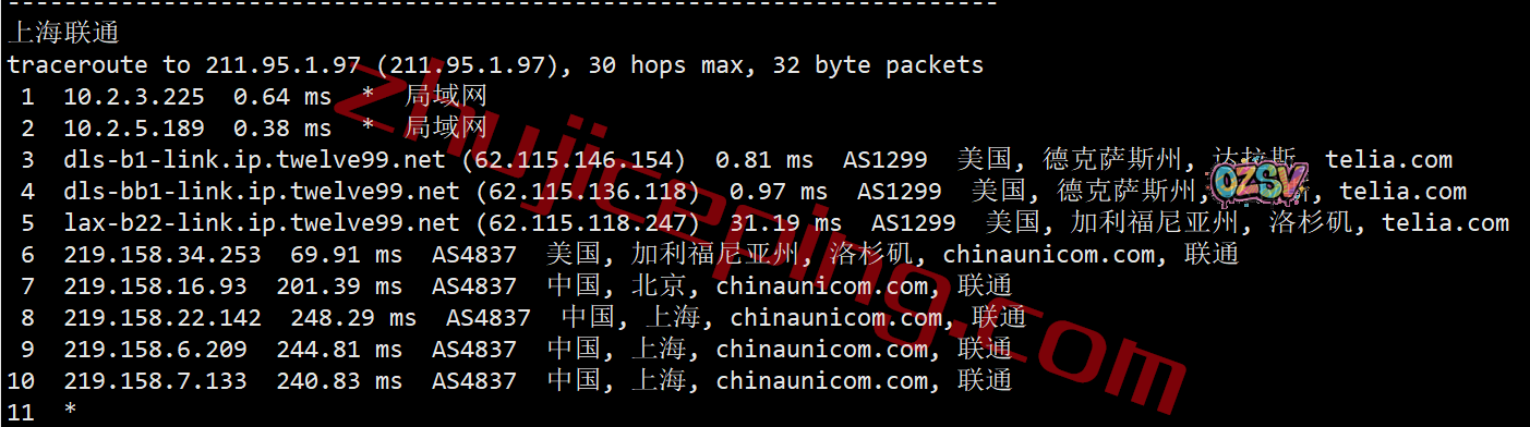 上海、广州方向:走telia到洛杉矶,从联通洛杉矶节点直连回国