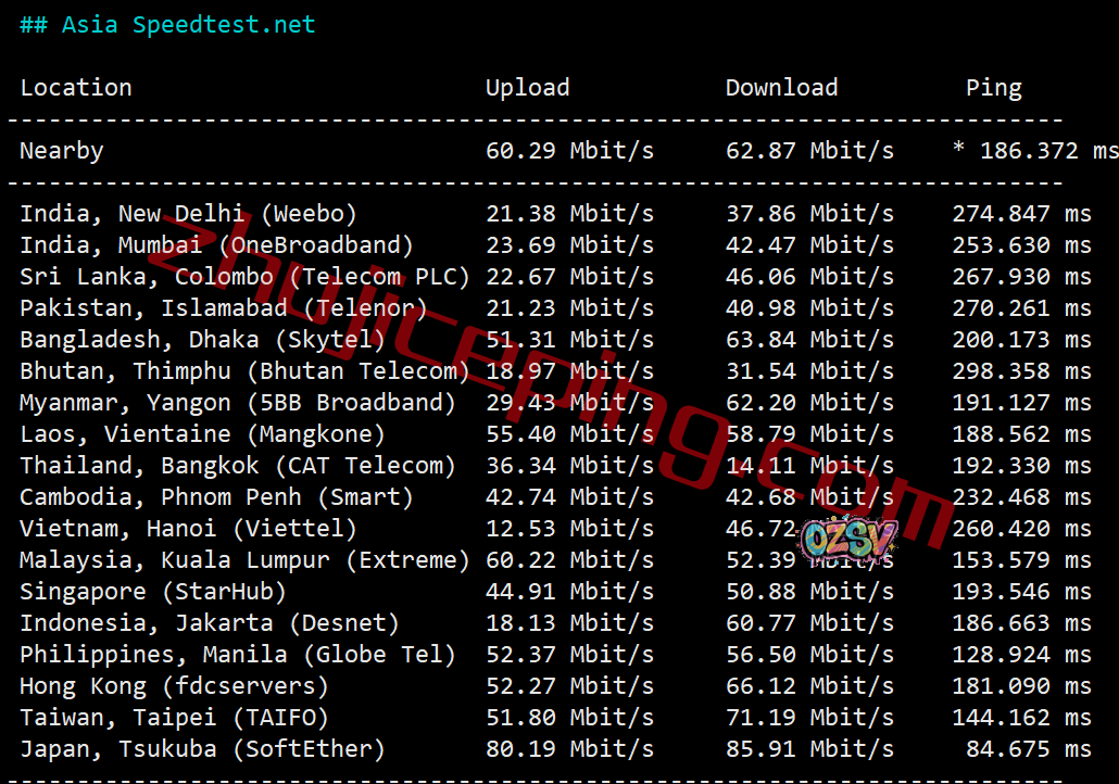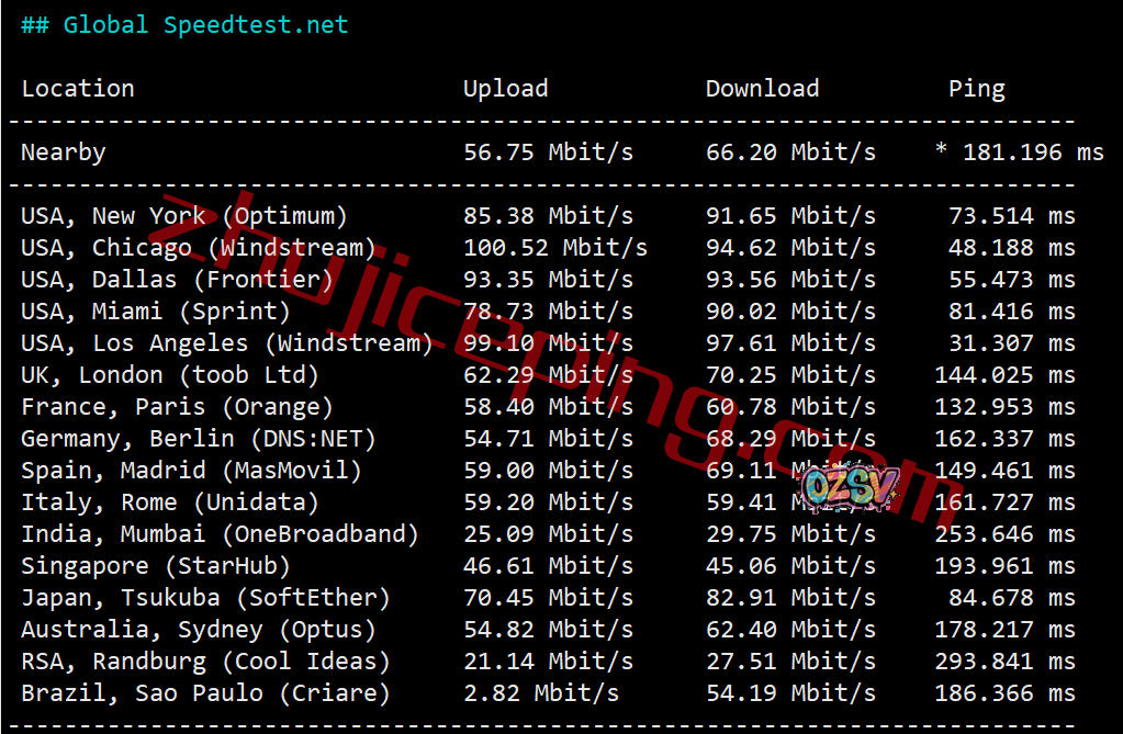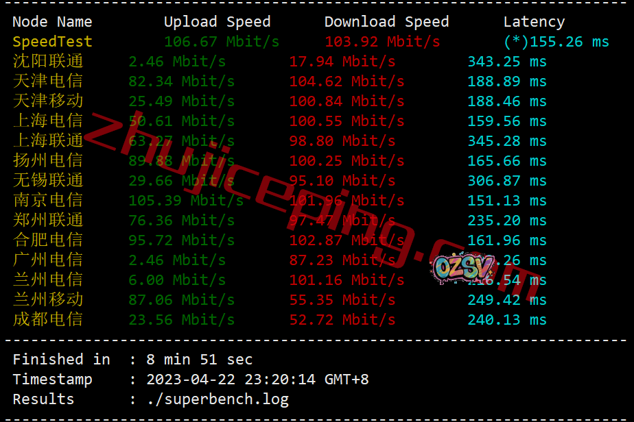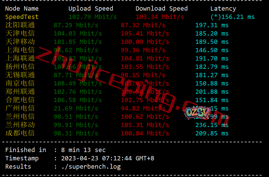 最低配给的就是100Mbps带宽,我们用speedtest的国内三网节点测试看看,上下行能跑多少如下图: