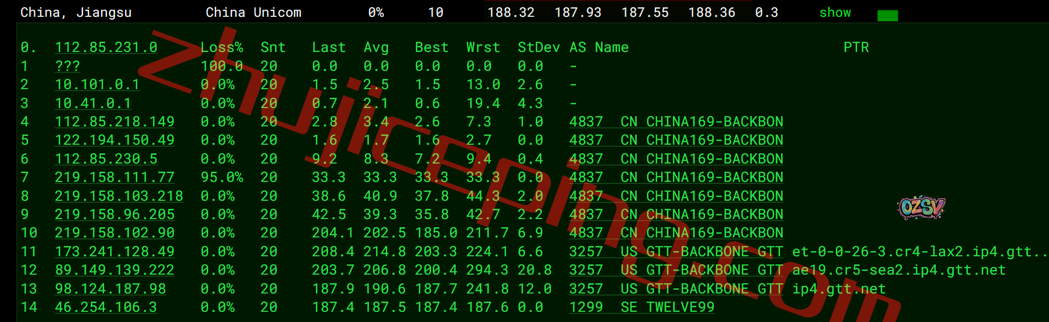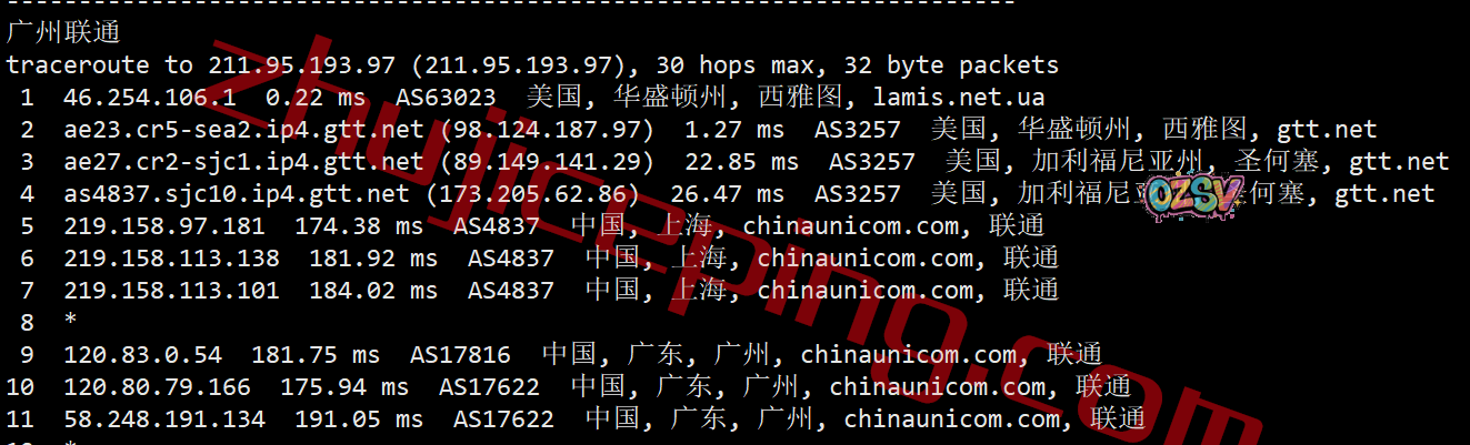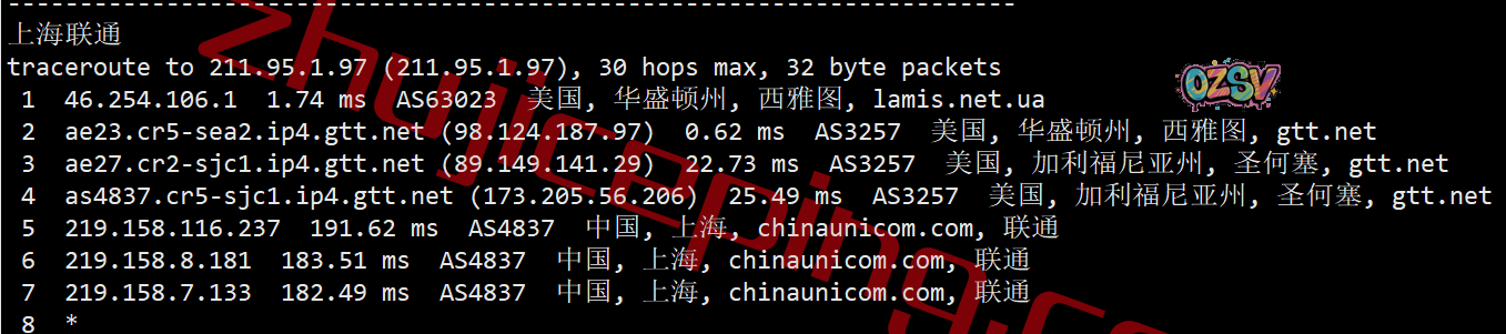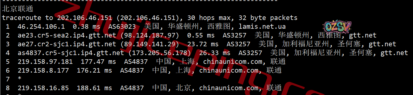 联通回程:走GTT从圣何塞出海回国,纯国际线路