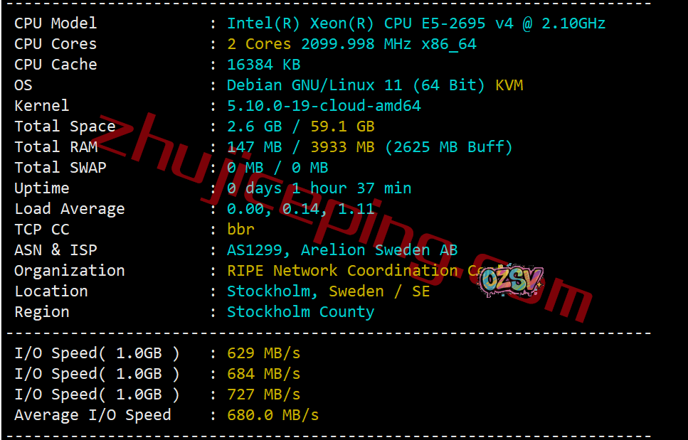 一样的CPU,都是e5-2695v4(2.1GHz主频,加速频率3.6GHz),站长启用了BBR,广播IP,当前硬盘I/O大致680MB/S的样子: