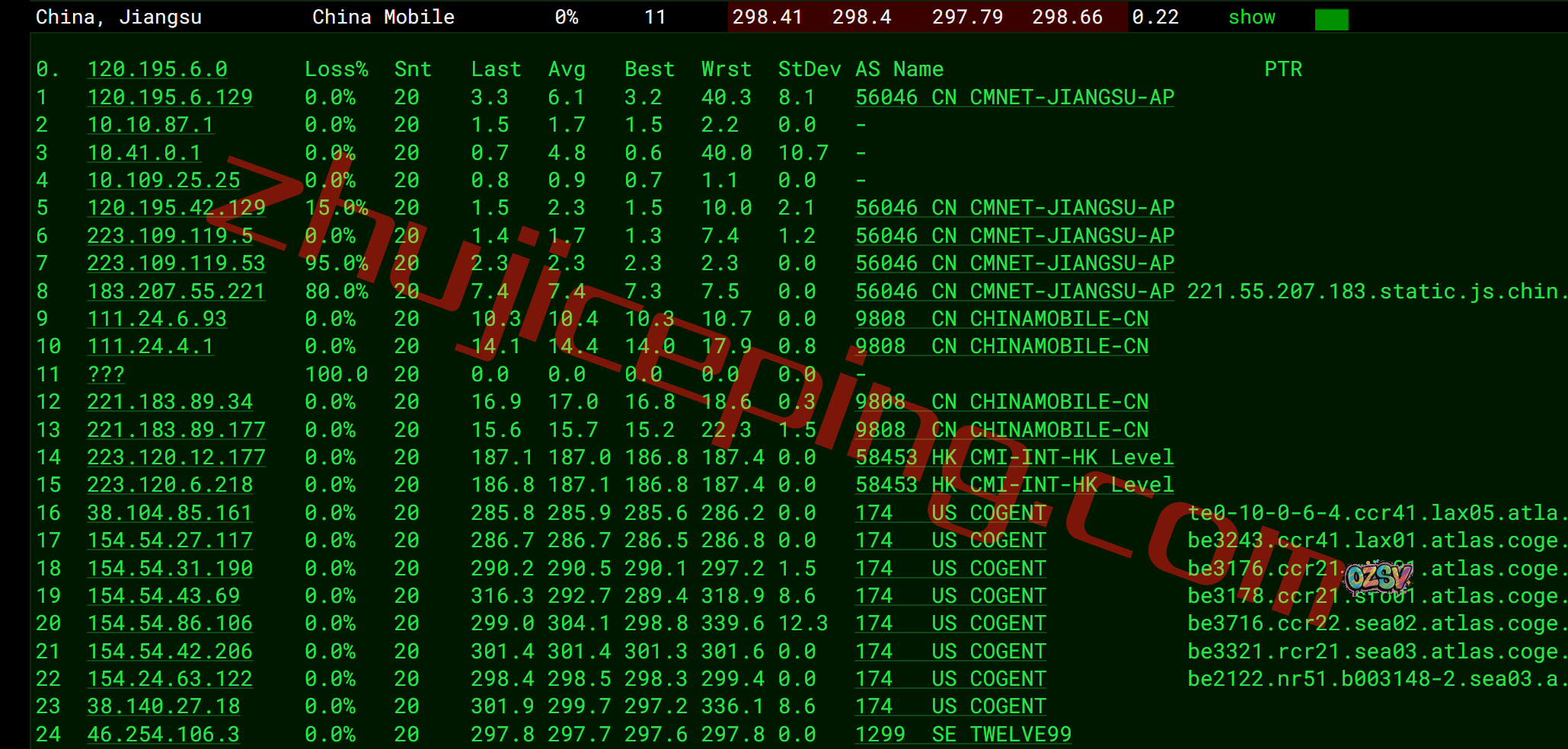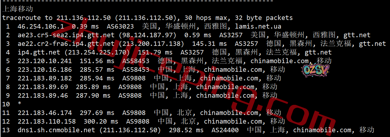 上海方向:走GTT直接到德国法兰克福,从移动法兰克福节点直连回国