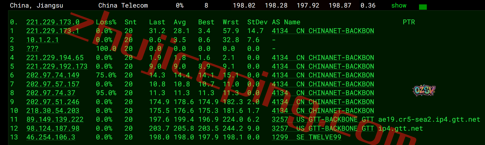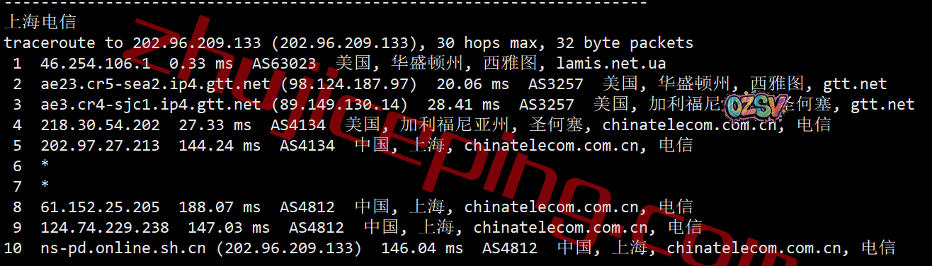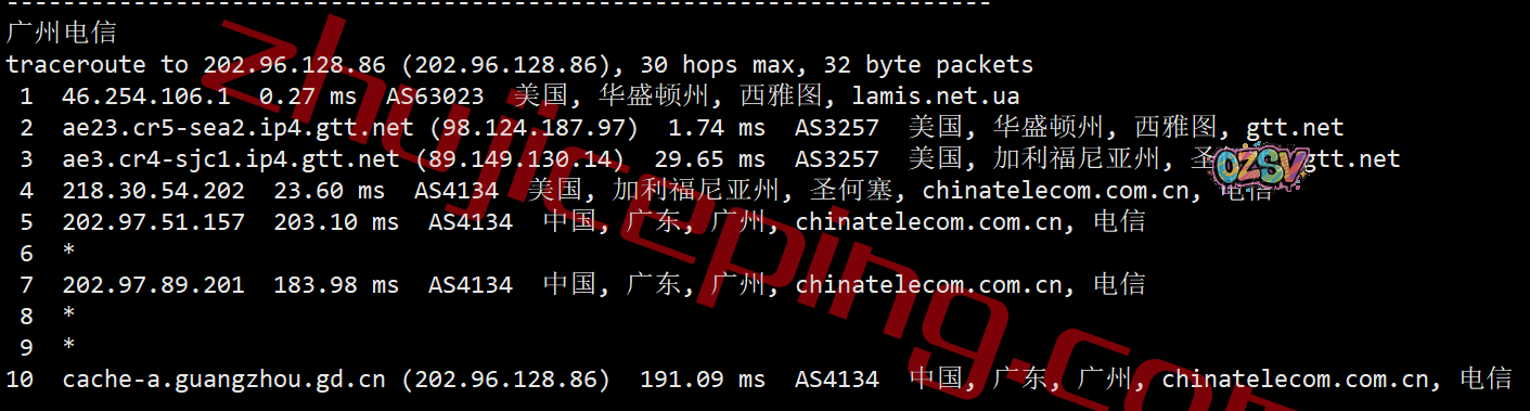 电信回程:走GTT到圣何塞,从电信圣何塞节点直连回国