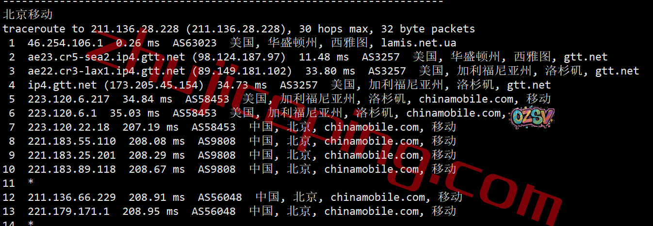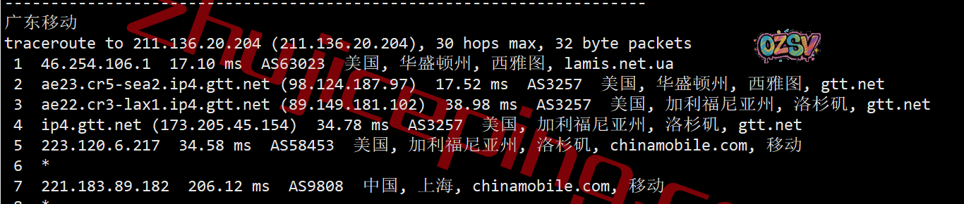 北京、广州方向:走GTT到洛杉矶,从移动洛杉矶节点直连回国