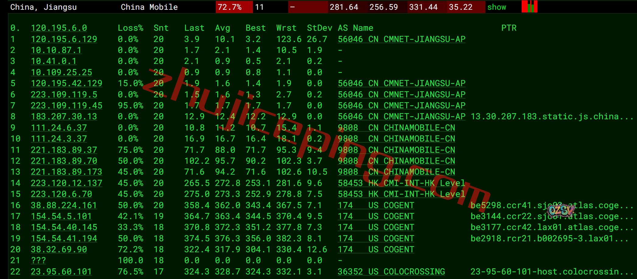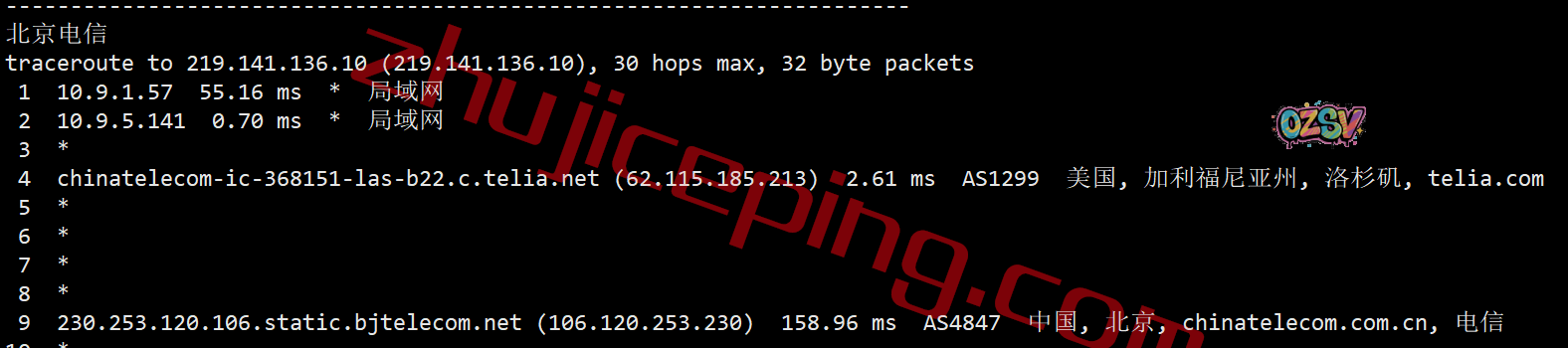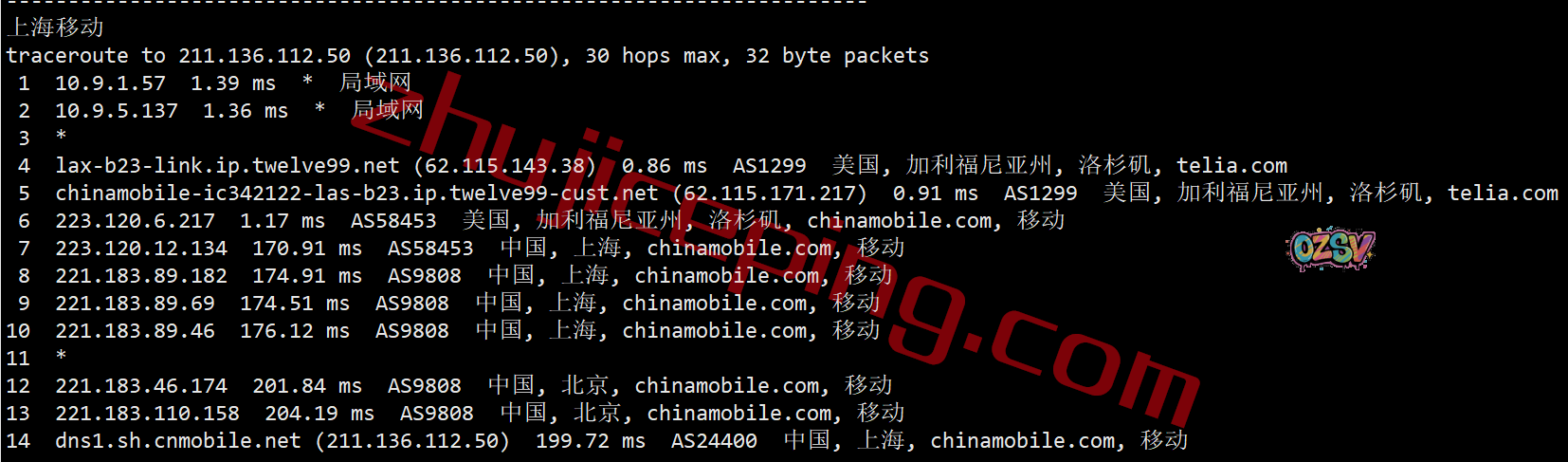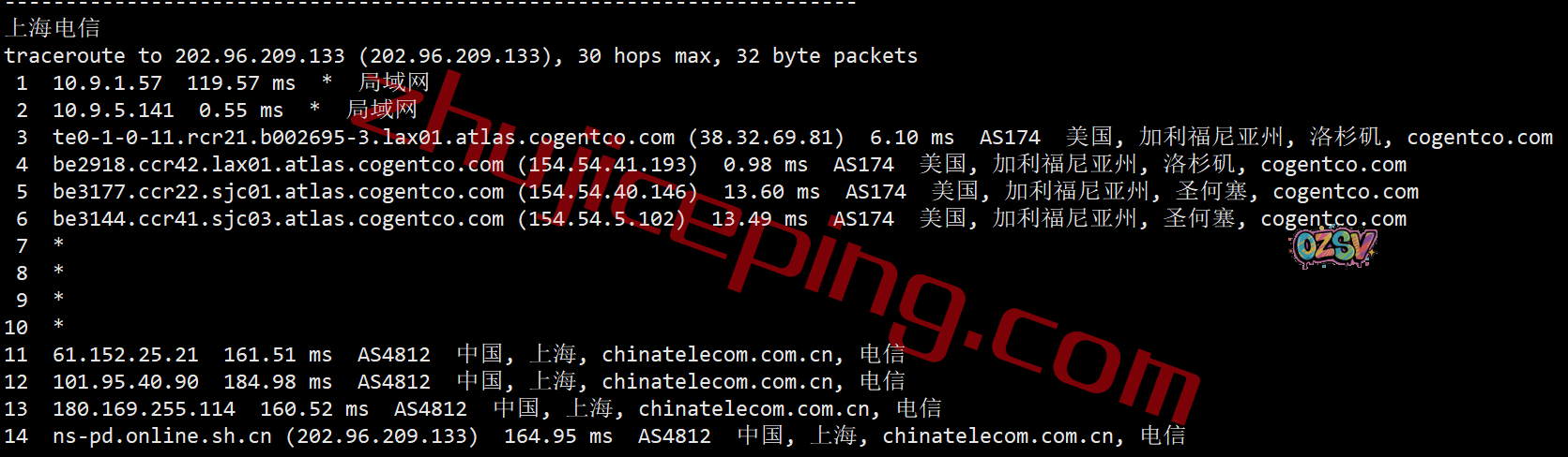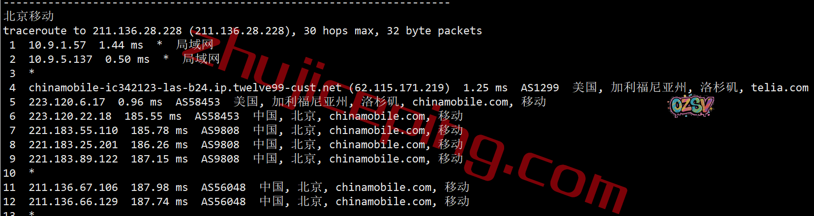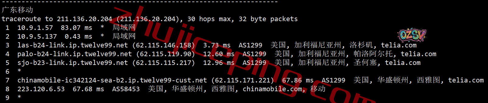 移动去程:直连移动圣何塞节点后走cogent去洛杉矶机房