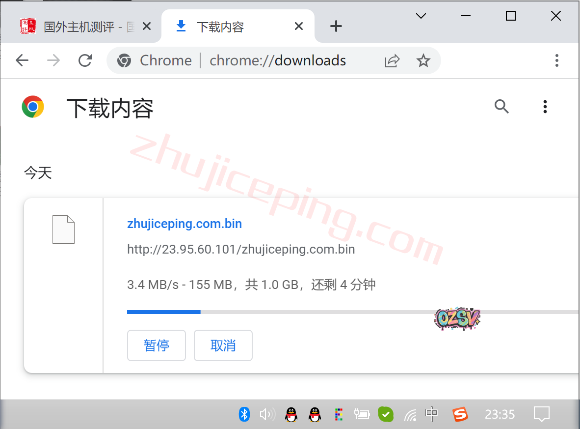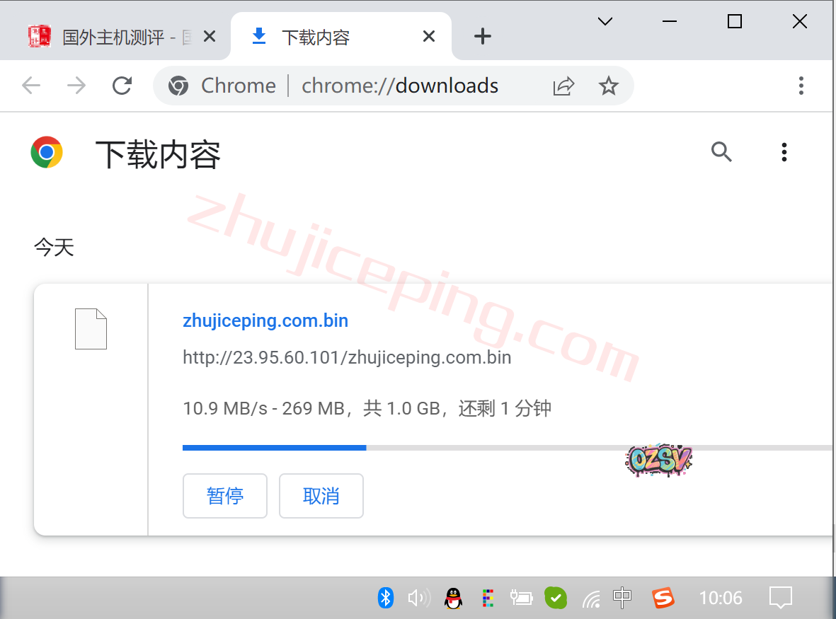 广州电信家庭带宽,直接用浏览器下载存放在测试小鸡上面的文件,大致看看速度: