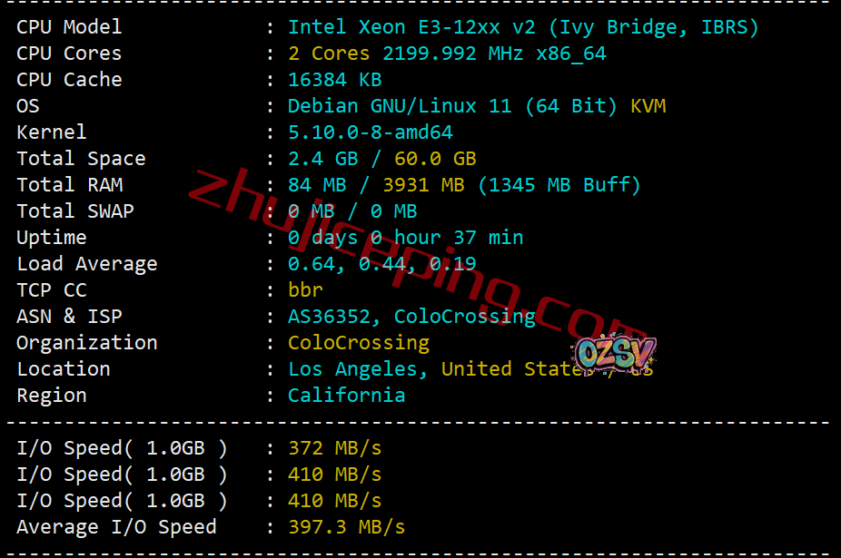 经过虚拟化后CPU型号未知,估计也是商家不想让大家知道,主频是2.2GHz,站长启用了BBR,用的colocrossing的网络,当前硬盘I/O大致397MB/S的样子: