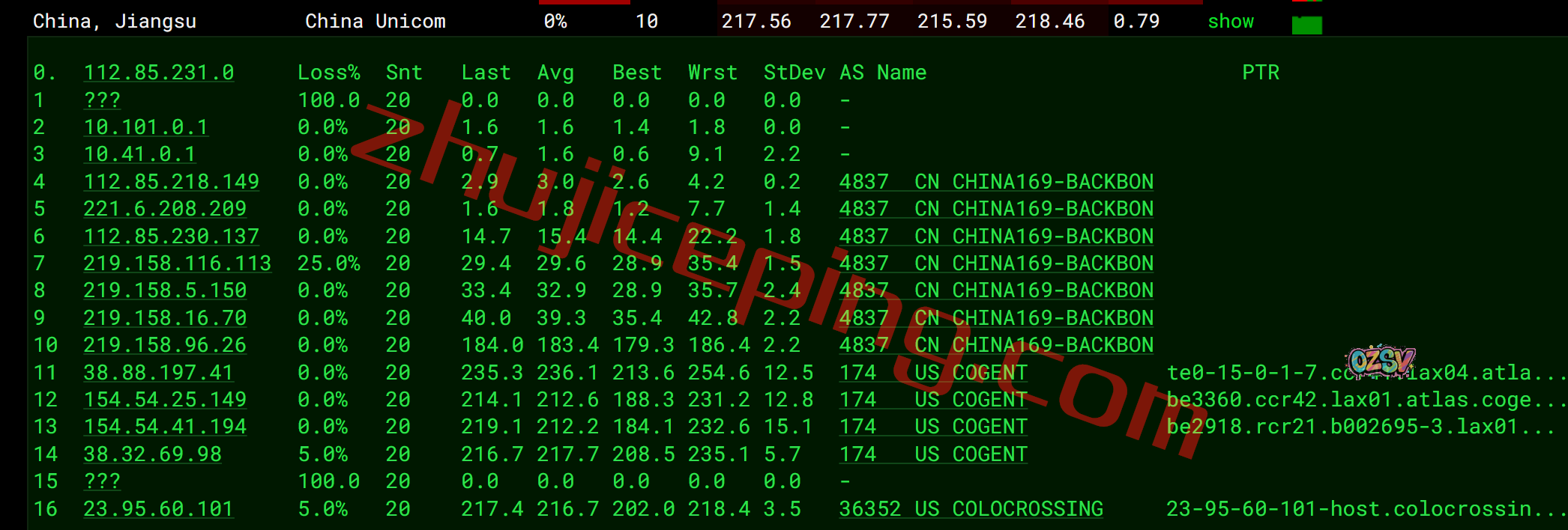联通去程:直连联通洛杉矶节点后走cogent去机房
