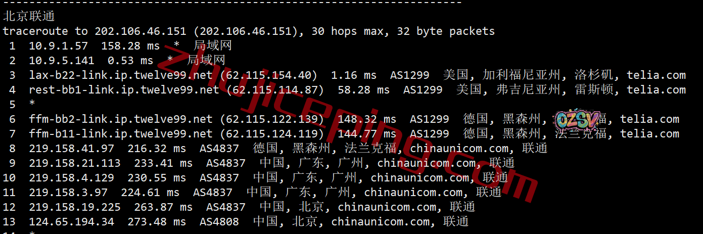 北京方向:走telia从东海岸出海去德国,从联通德国法兰克福节点直连回国