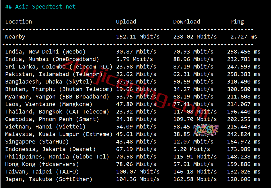 跑几个speedtest亚洲区域内的节点看看情况: