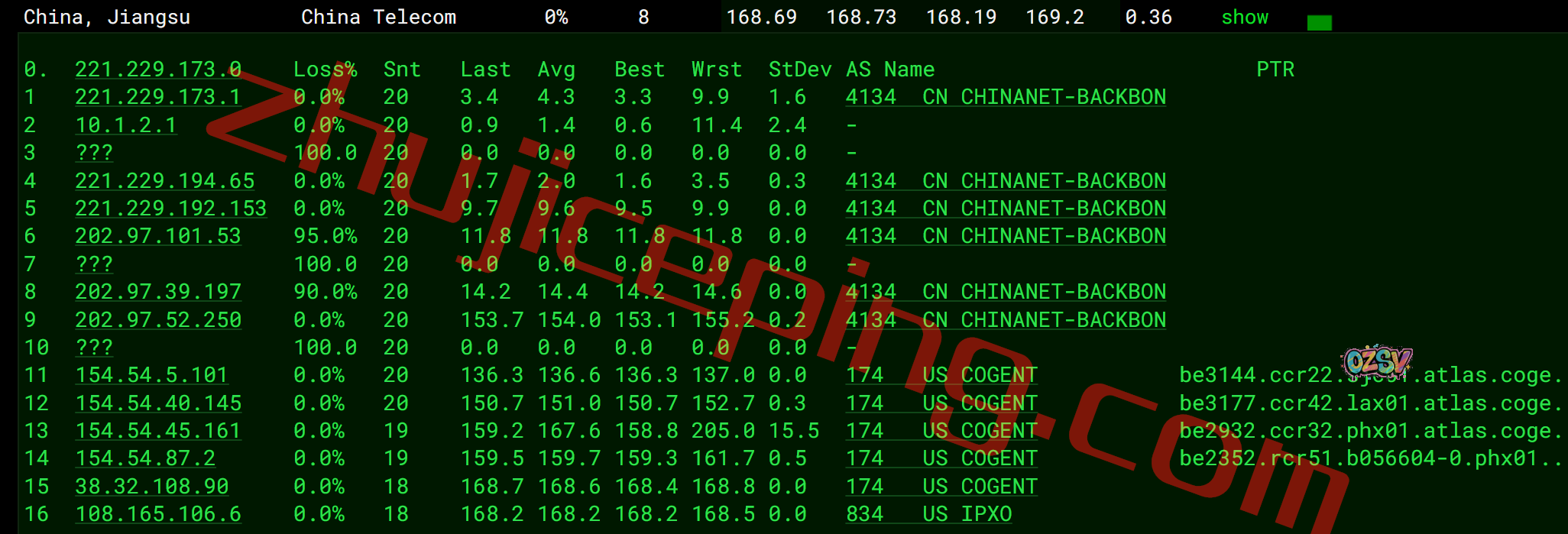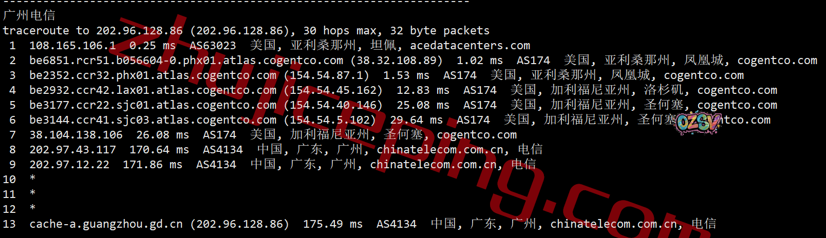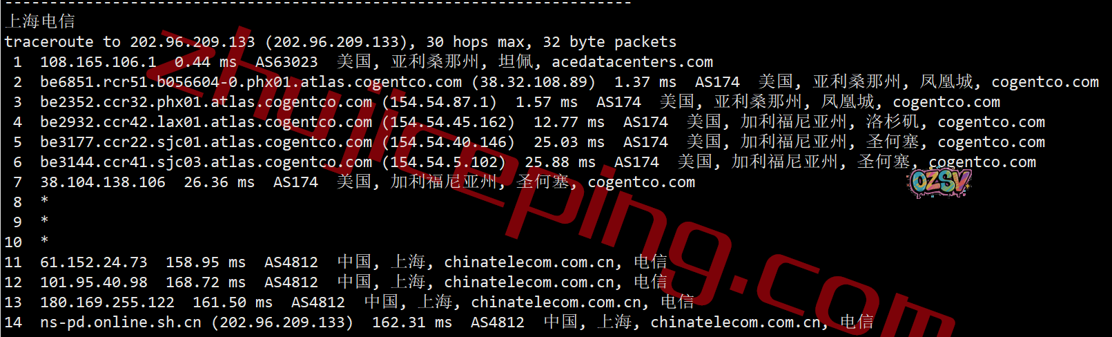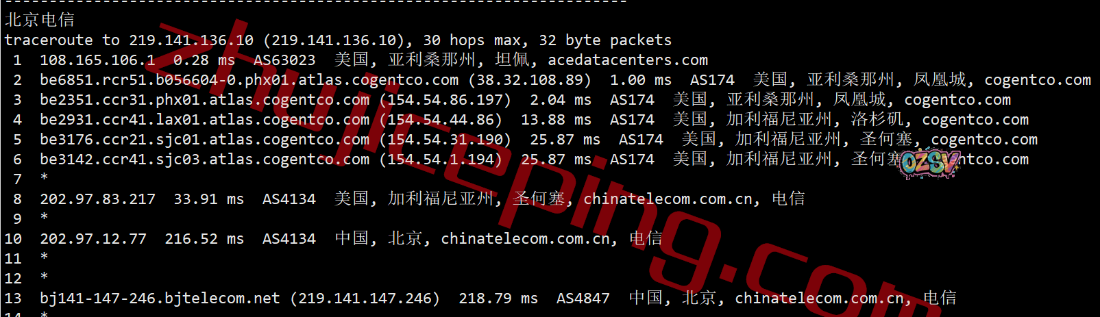 电信去程:直连电信圣何塞节点,然后走cogent去凤凰城