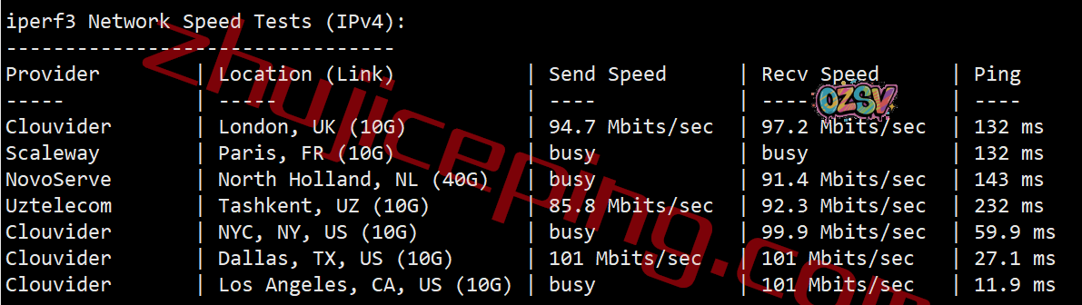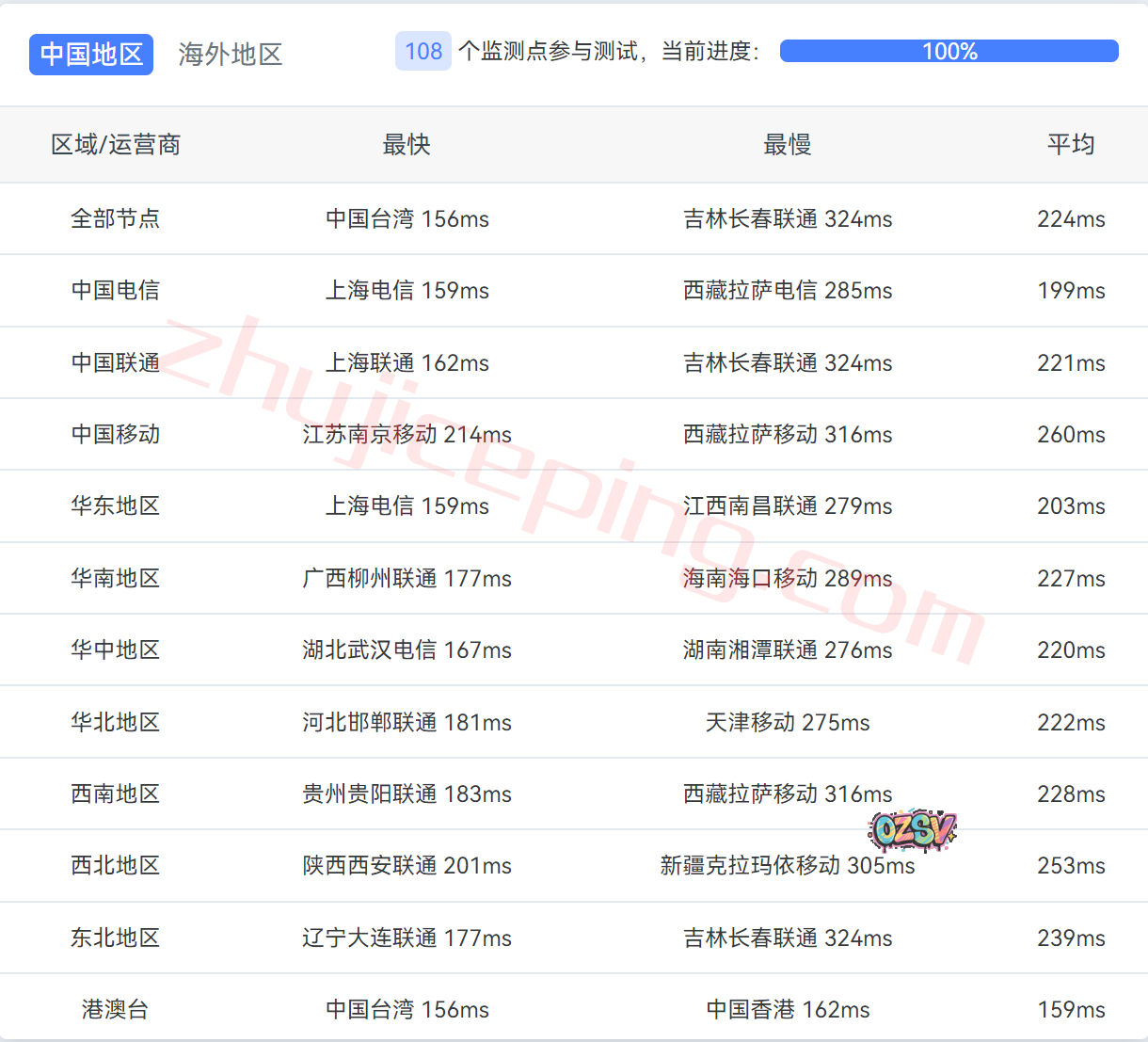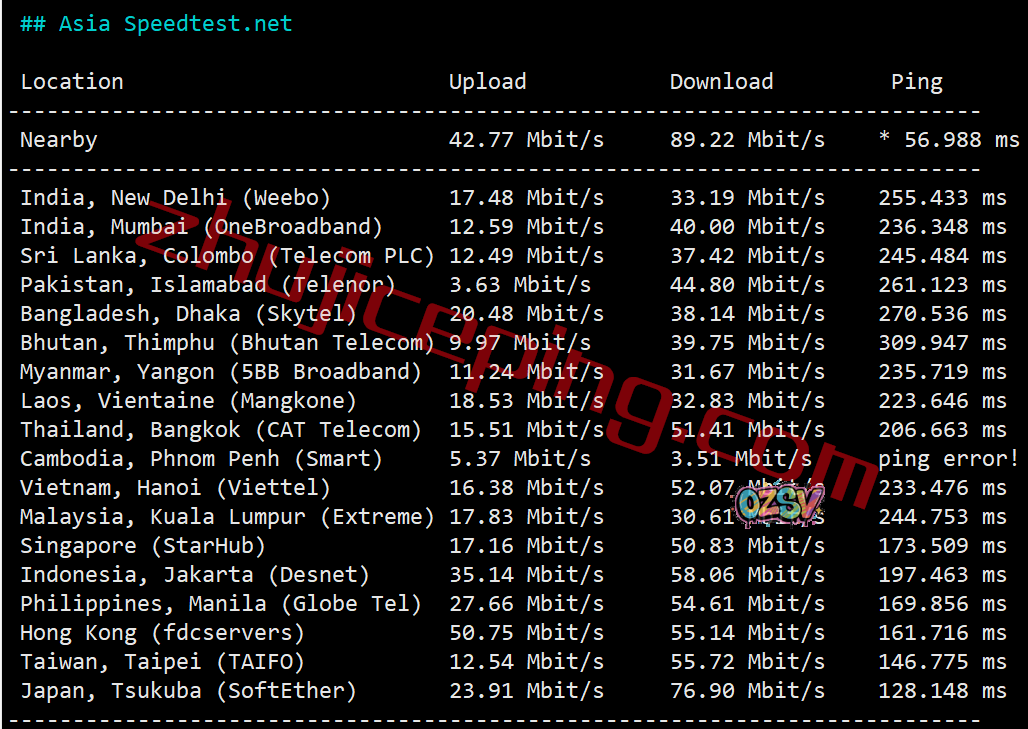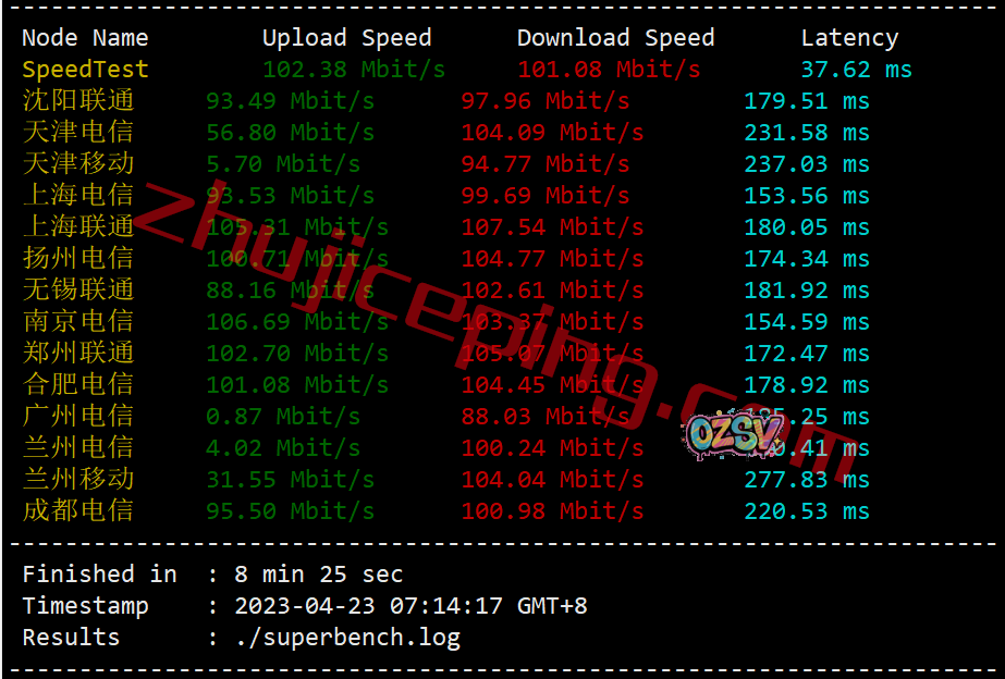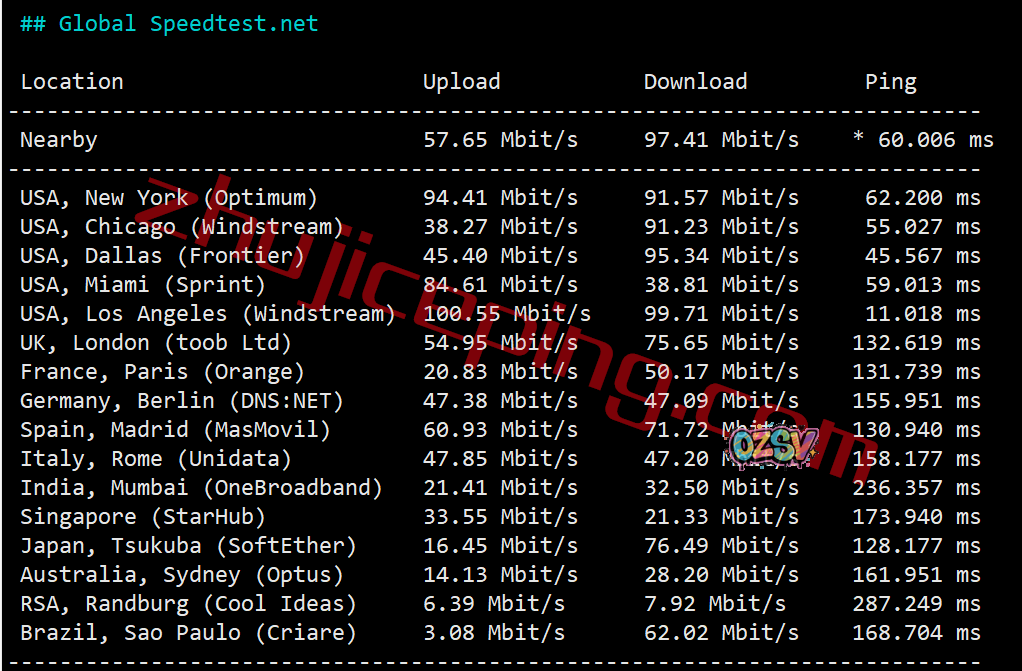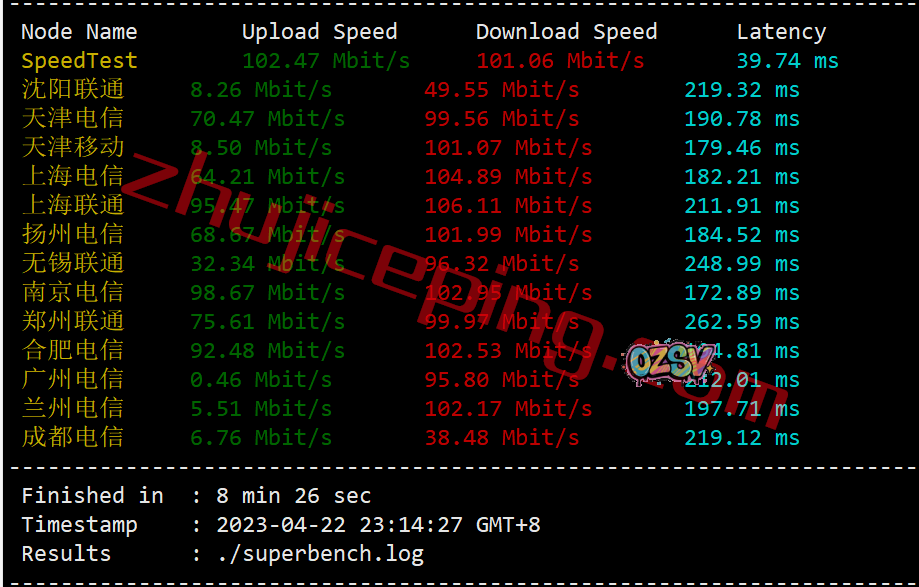 最低配置默认是100Mbps带宽,我们用speedtest在国内的部分三网节点跑一下上下行带宽,看看能到多少吧? 大致数据如下:
