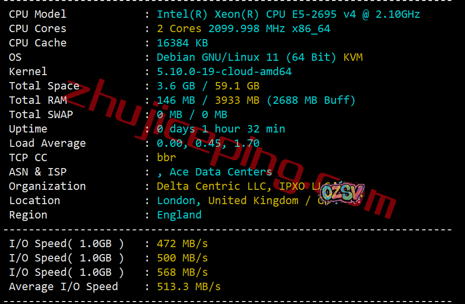 CPU就是官方自己公布的e5-2695v4(2.1GHz主频),目前为止各个数据中心还没有看见不同的型号;站长启用了BBR,广播IP,当前硬盘I/O大致在512MB/S的样子: