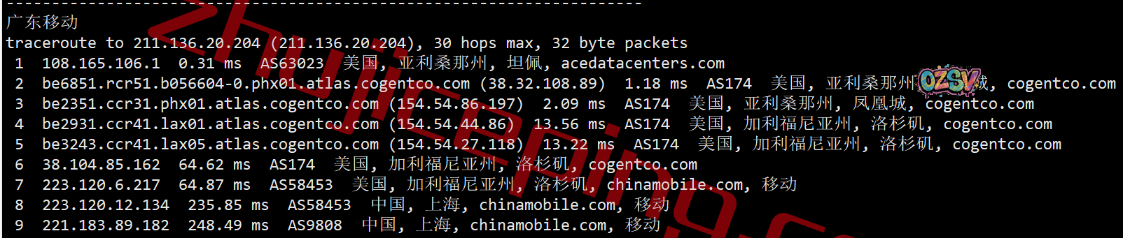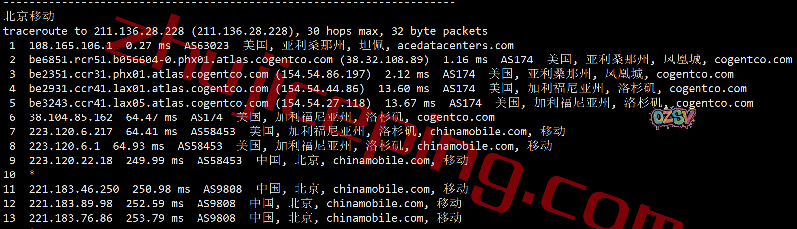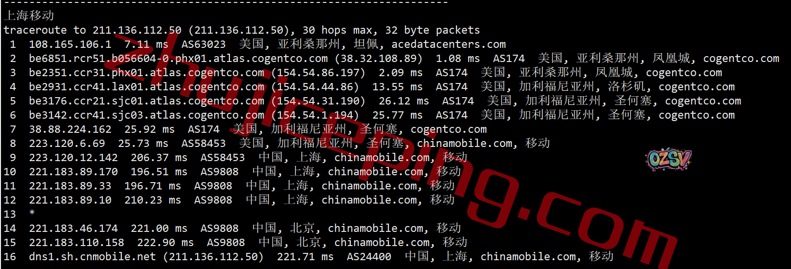 移动去程:直连移动圣何塞节点,然后走cogent去凤凰城