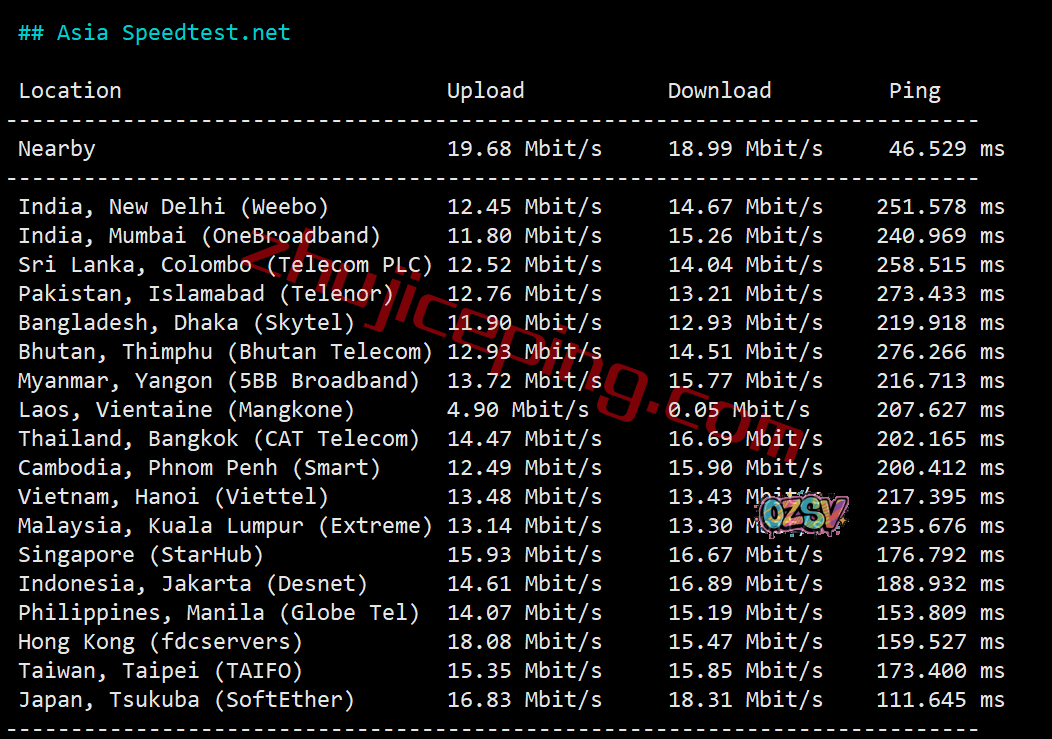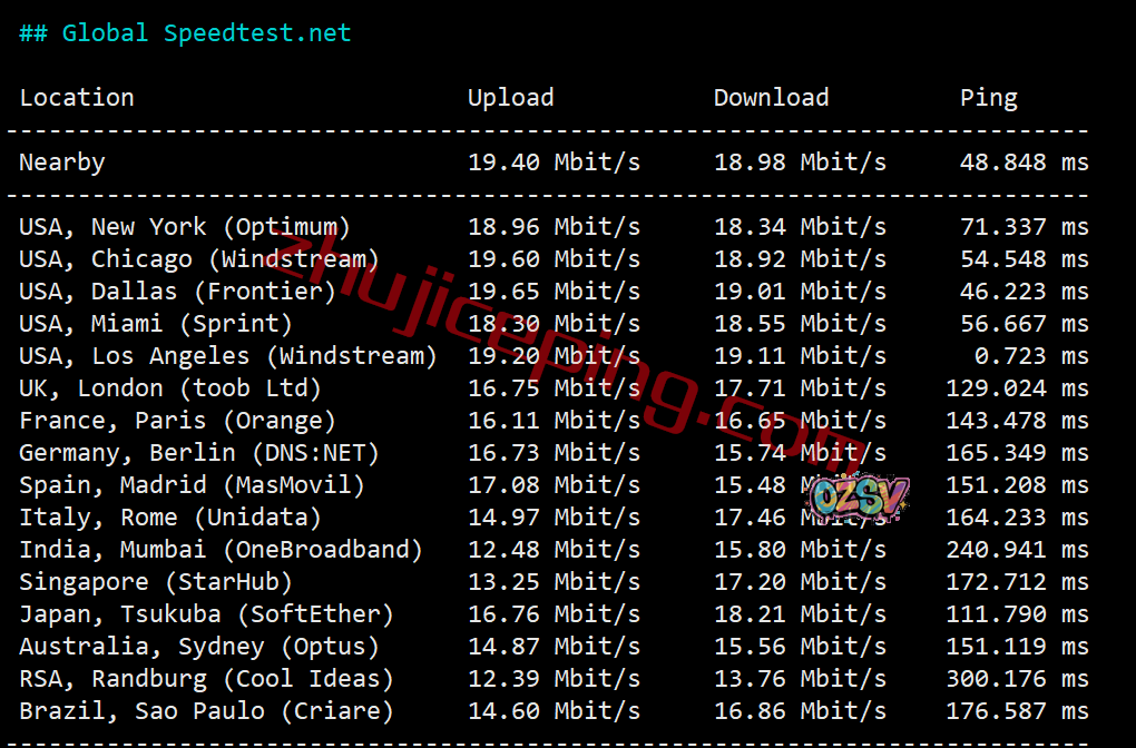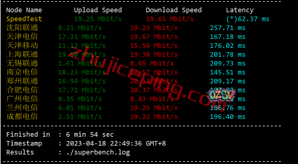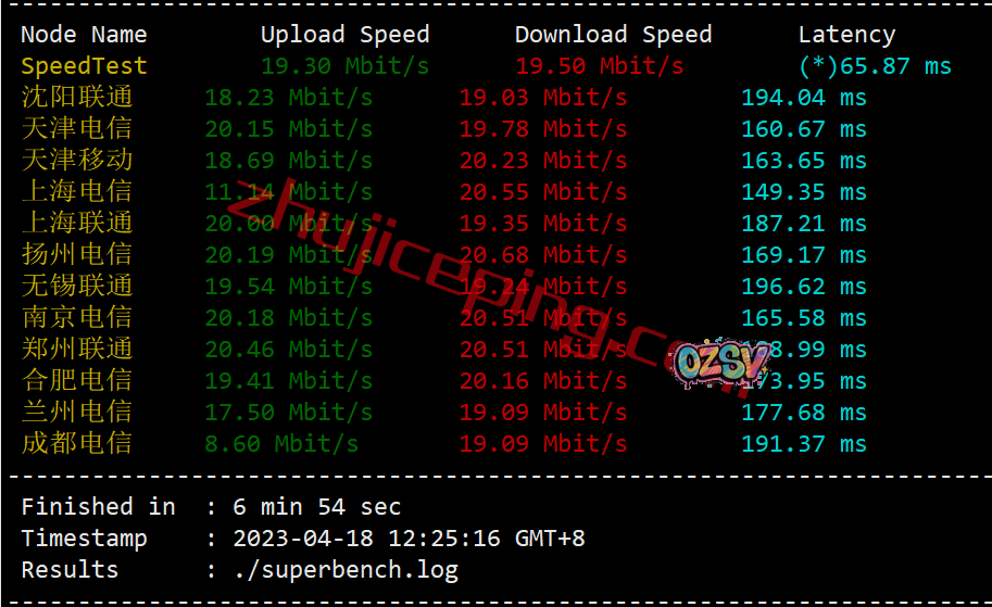 本次测试用的是20Mbps带宽的VPS,我们用speedtest在国内的三网节点跑一下上下行带宽,看看能冲到多少?大致如下: