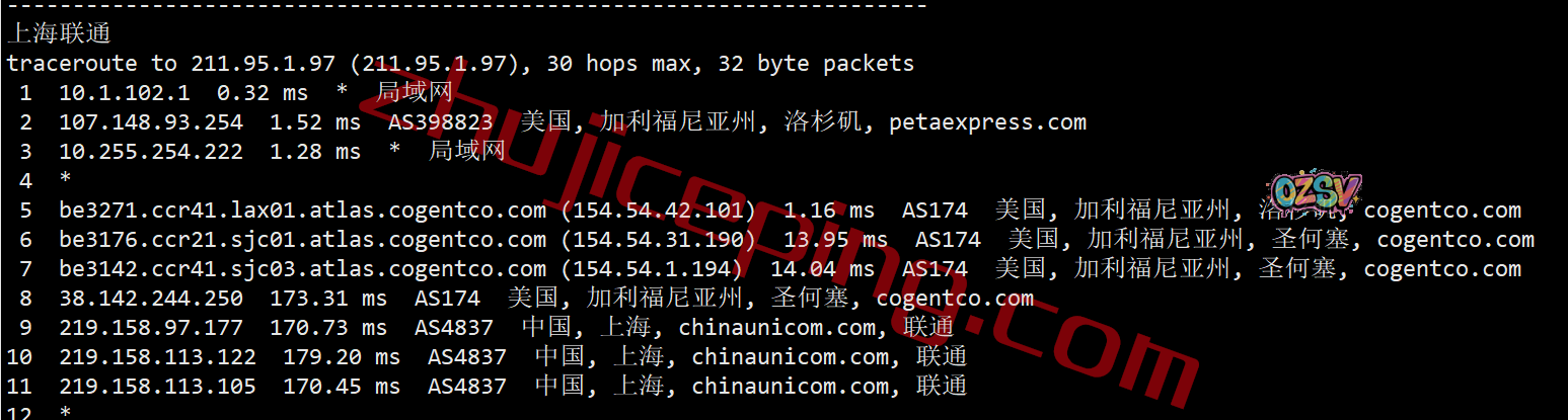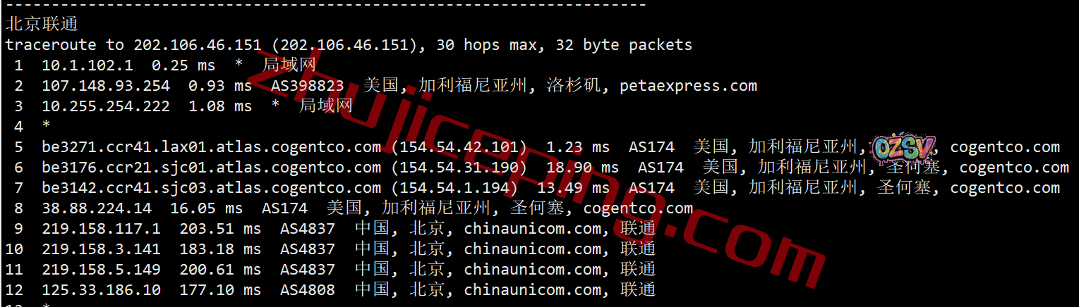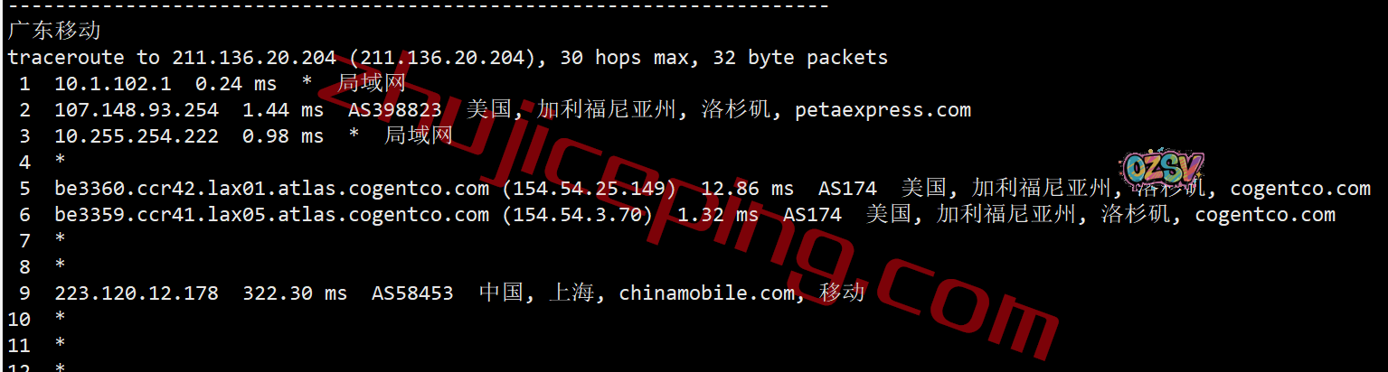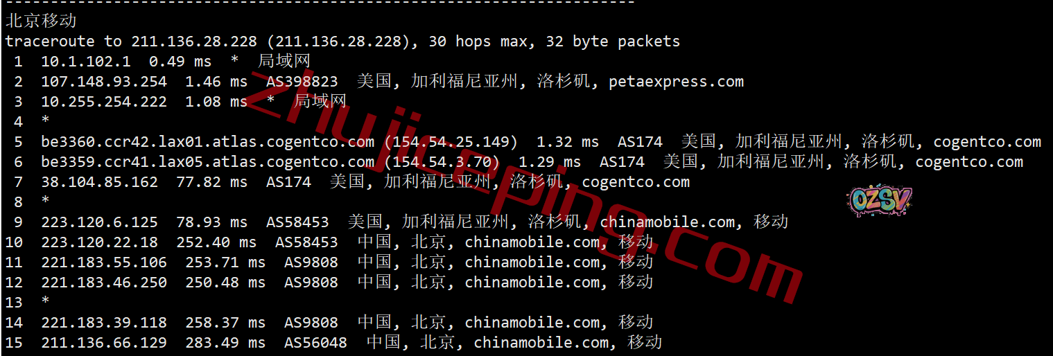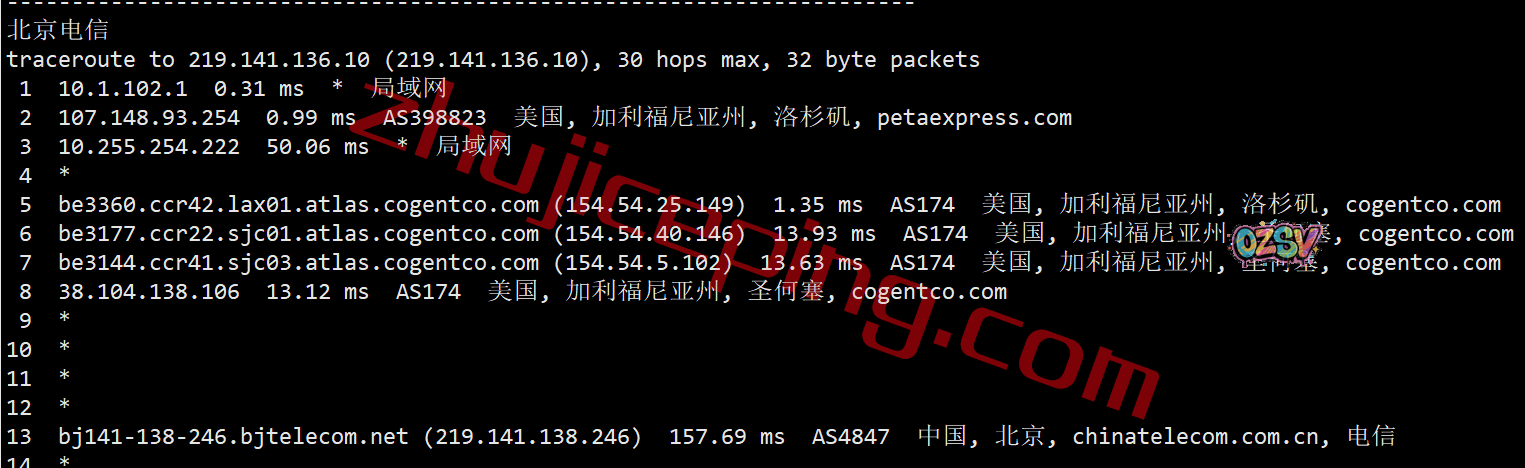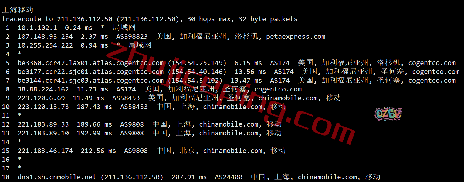 北京、上海方向:走cogent接移动洛杉矶/圣何塞节点后直连回国