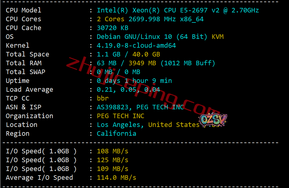 CPU型号为e5-2697v2(2.7GHz主频,睿频3.5GHz),站长启用了BBR,raksmart自己的AS,当前硬盘I/O大致114MB/S的样子: