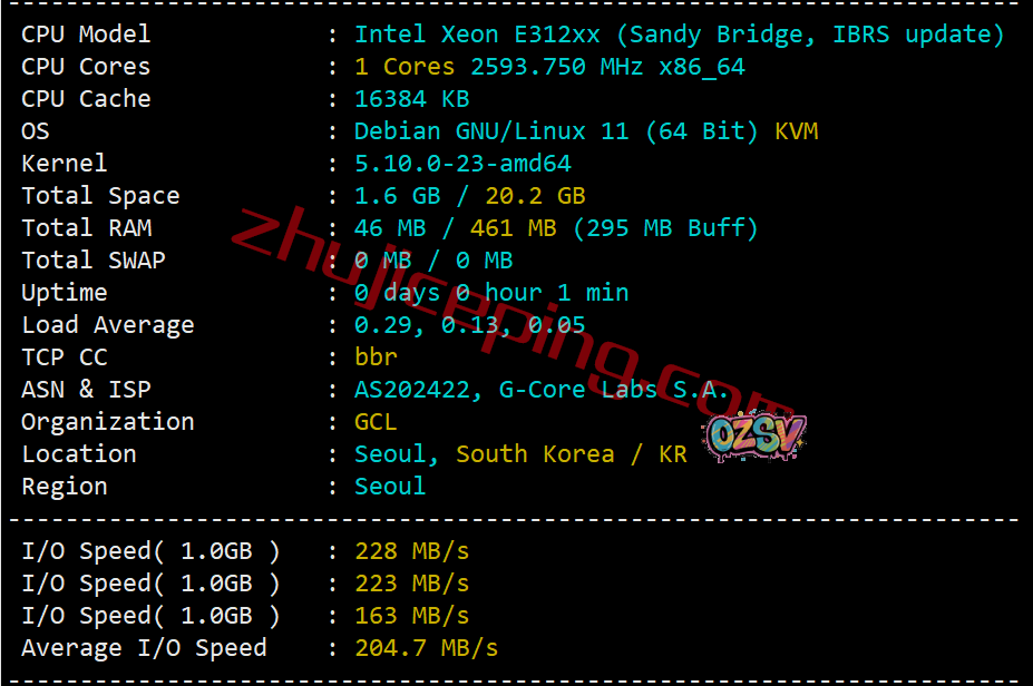 CPU具体型号未知,e3-12xx是虚拟化过后的,非真实的,主频大致2.6GHz;站长开通了BBR,gcore的AS,韩国首尔数据中心,当前硬盘I/O大致在204MB/S的样子: