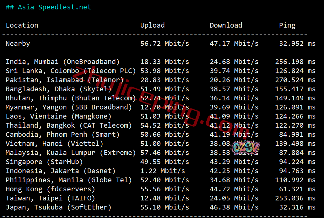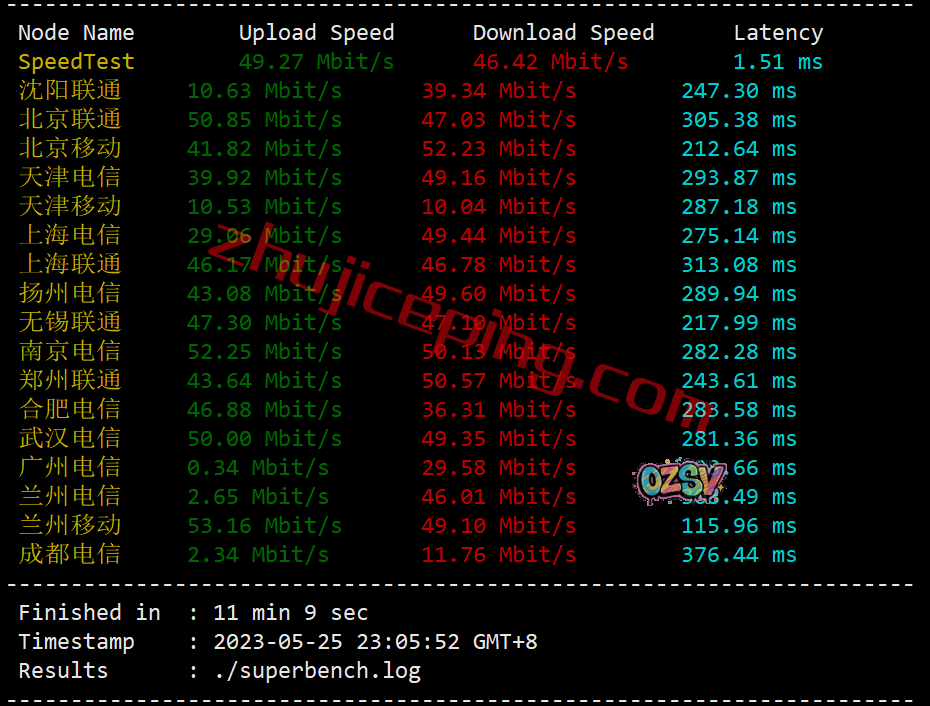 带宽大小根据VPS的配置由低到高,分别给50Mbps~200Mbps,本次测试的是低配50Mbps带宽。我们用国内speedtest的三网不同节点测试一下看看上下行能冲到多少吧?测试结果如下: