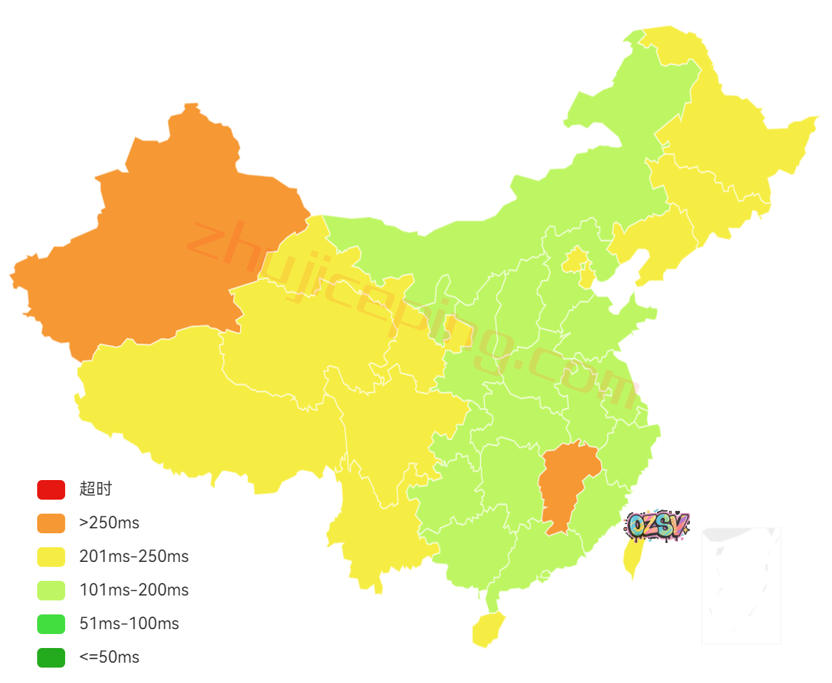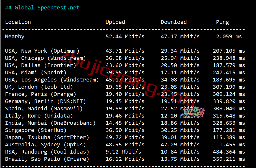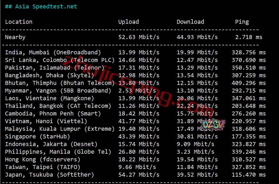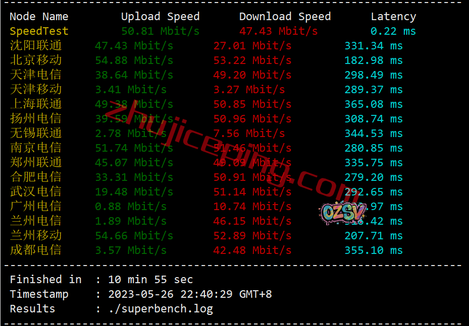 测试用的最低配,给的是50Mbps带宽,我们用speedtest.net在国内的三网节点跑一圈,看看在国内上下性能冲到多少,大致数据如下: