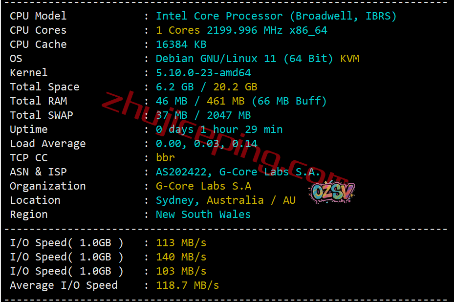 CPU型号未知,主频2.2GHz,站长启用了BBR,gcore自己的AS号,当前硬盘I/O大致在118MB/S的样子: