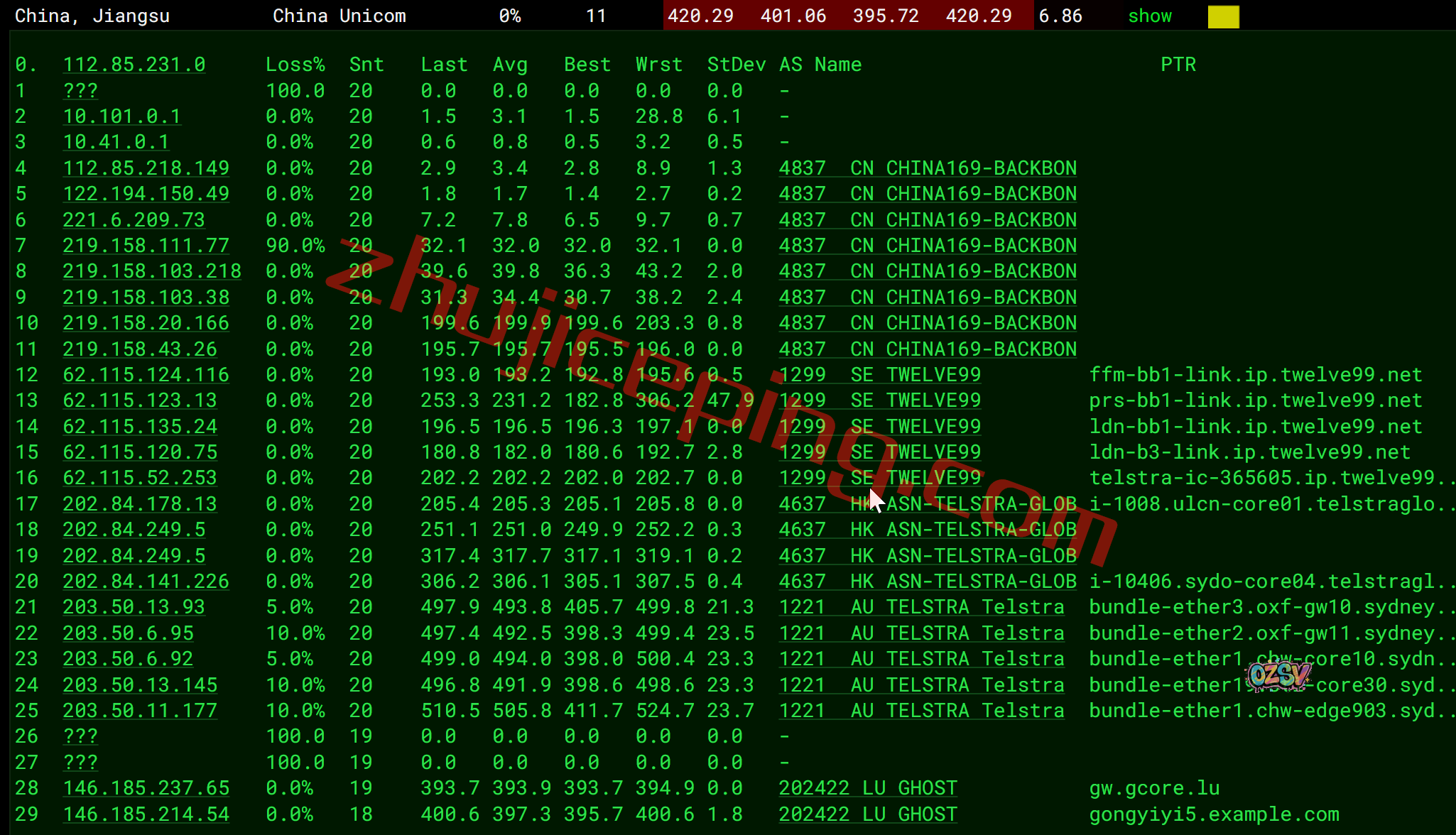 联通去程:直连联通法兰克福节点,然后走twelve99经过法国、英国然后走Telstra去澳大利亚