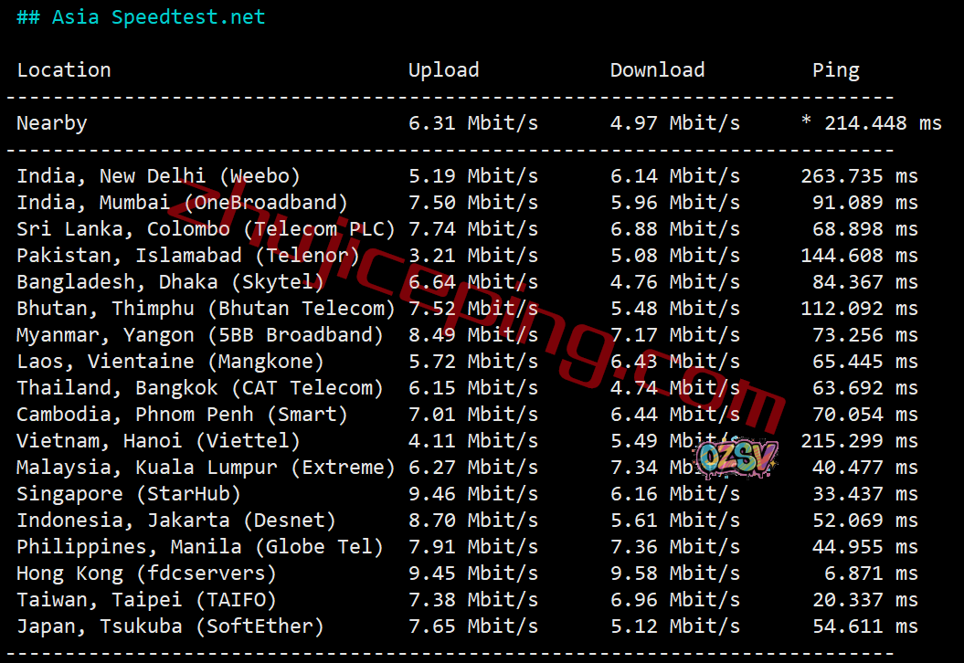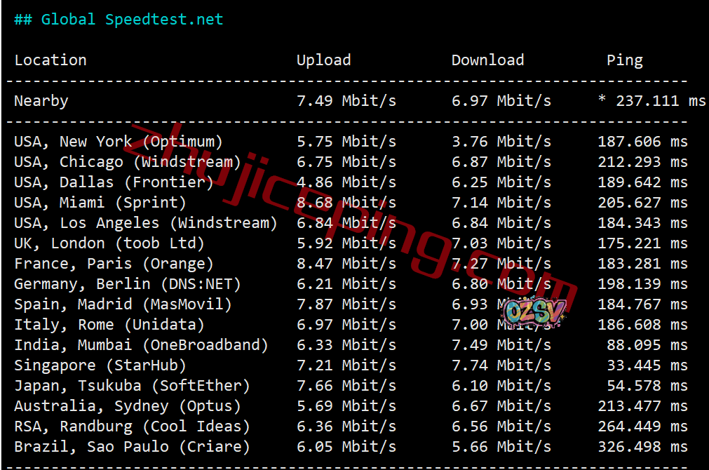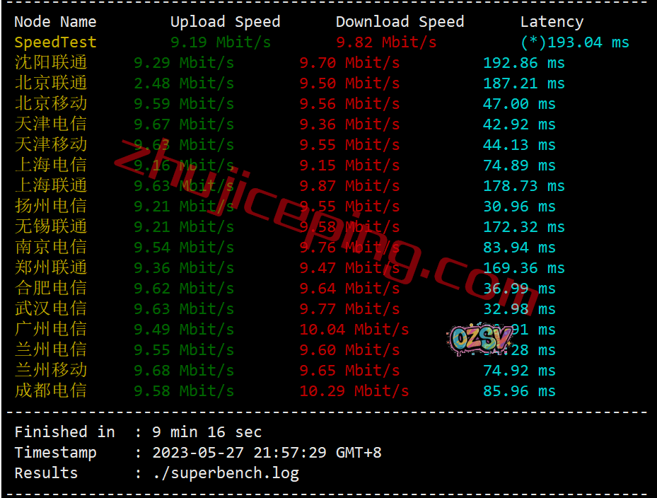 本次测试用的VPS默认给的是10Mbps带宽,我们用speedtest在国内的三网节点做个简单的测试,看看上下行能跑多少是否达标,大致结果如下: