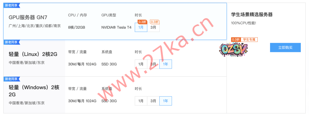 腾讯云学生云服务器近期做出了调整,目前腾讯云学生云服务器有北京、上海、广州轻量应用服务器(最高10M带宽端口轻量应用服务器可以选择)广州、上海、北京CVM云服务器(3M带宽不限流量云服务器),广州、上海、北京、重庆、成都、南京GPU服务器(8核32G内存高配置GPU云服务器)、中国香港、新加坡、东京轻量应用服务器(30M大带宽海外云服务器)可以选择,最低只需65元/年起!性价比超高,属于便宜腾讯云服务器!