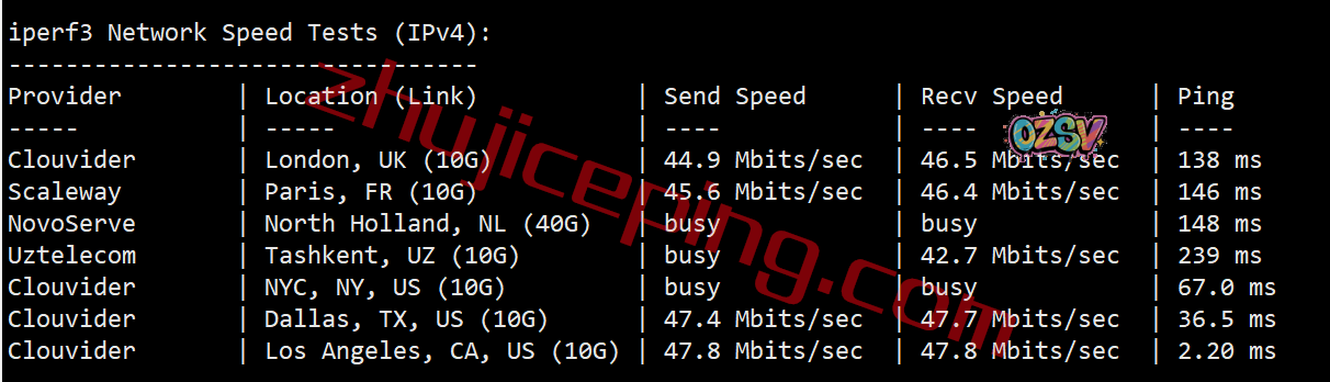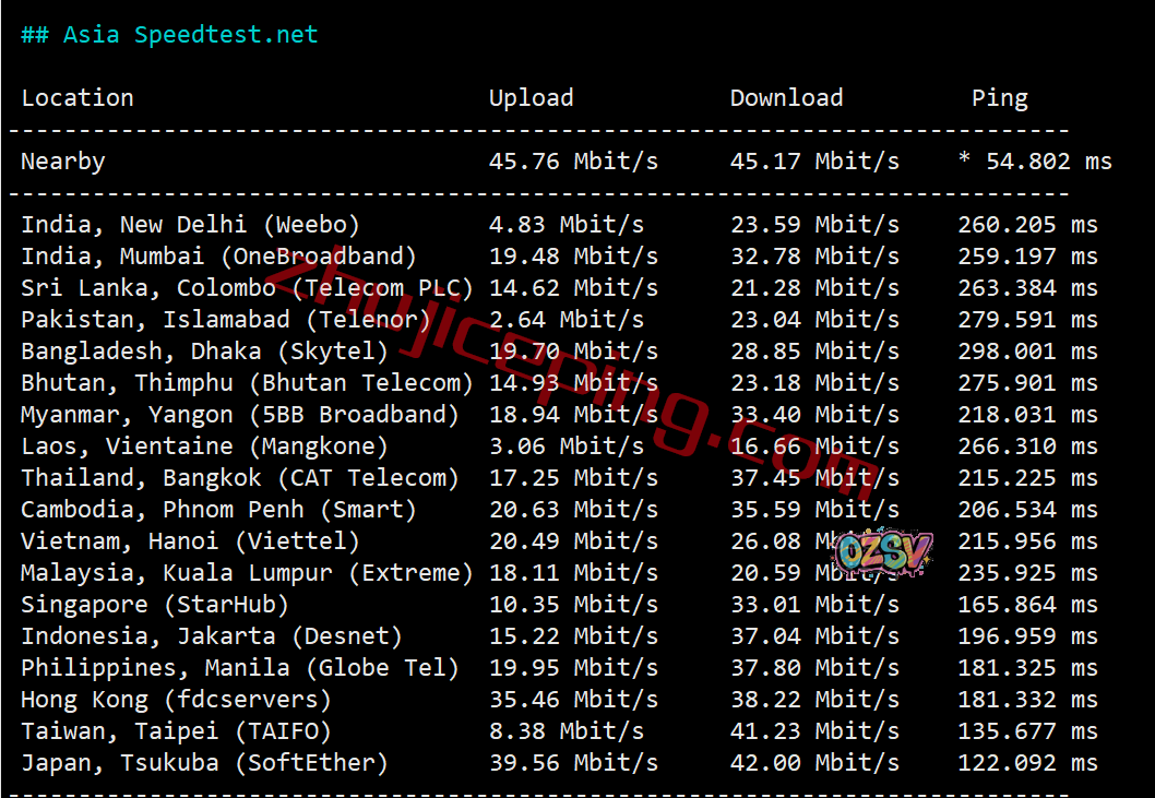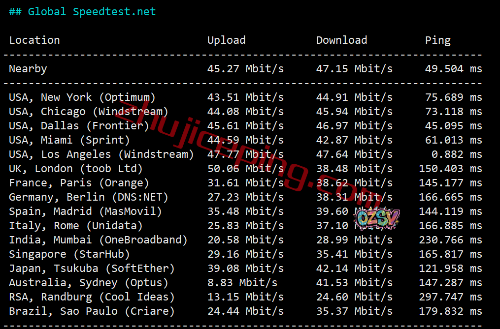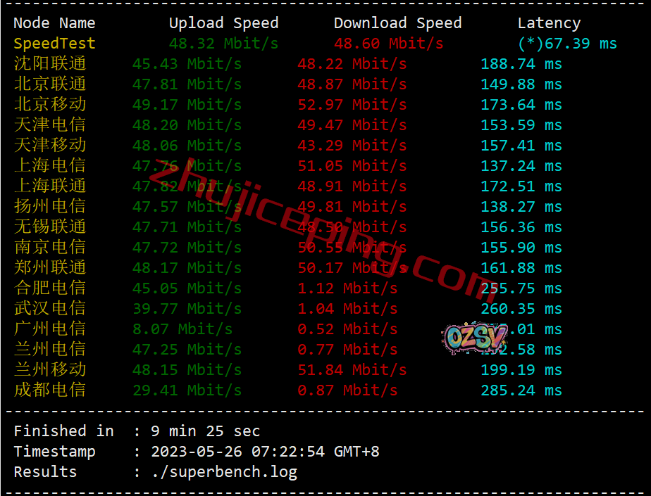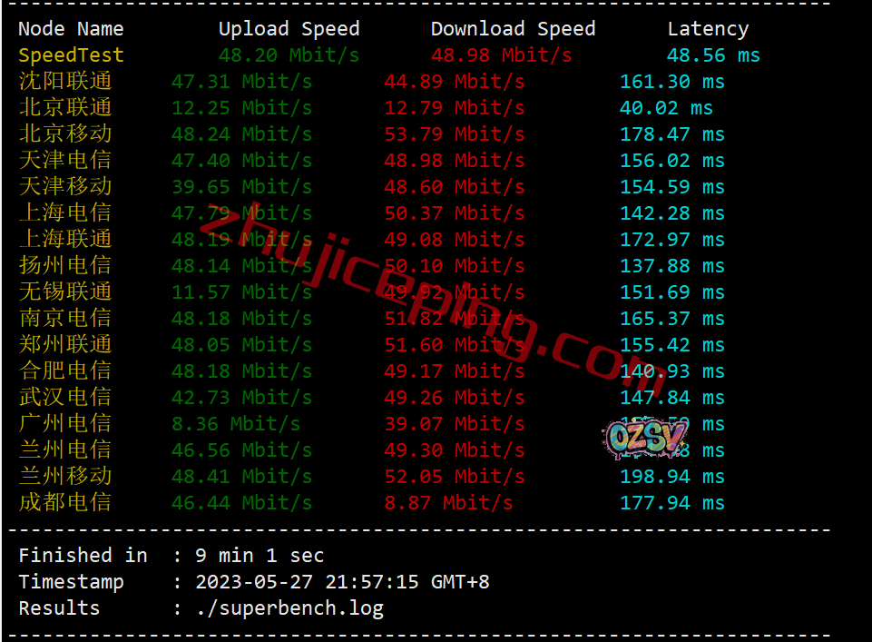 我们测试的这款小鸡的带宽为50Mbps,用speedtest的国内三网节点跑一圈看看上行线能冲到多少吧?大致的数据如下所示: