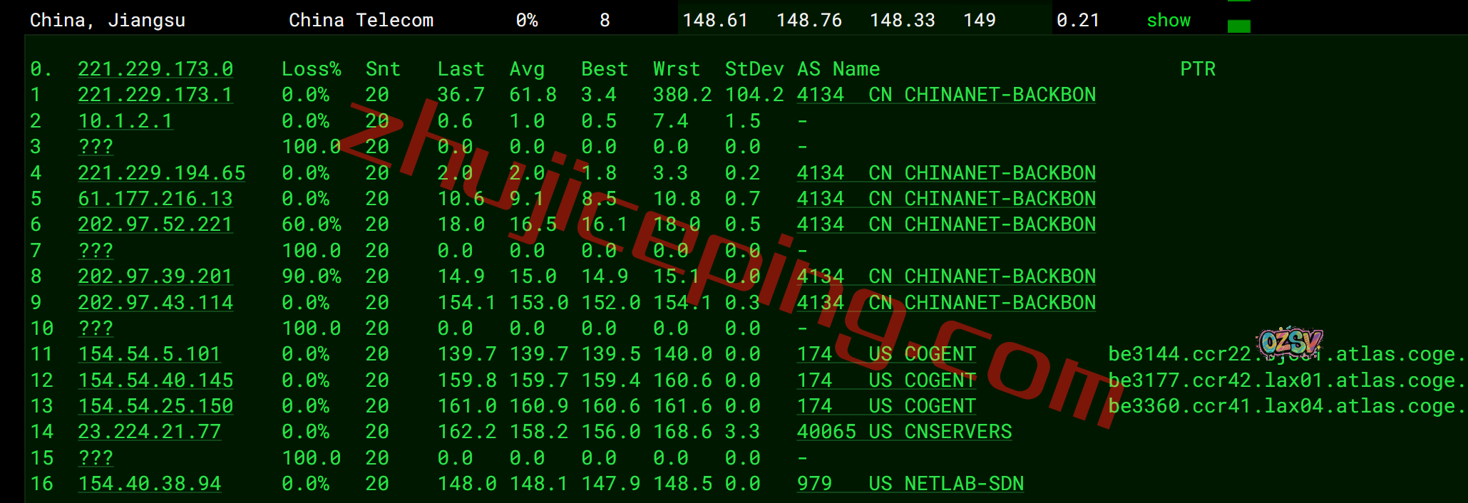 电信去程:直连电信圣何塞节点后接cogent去机房