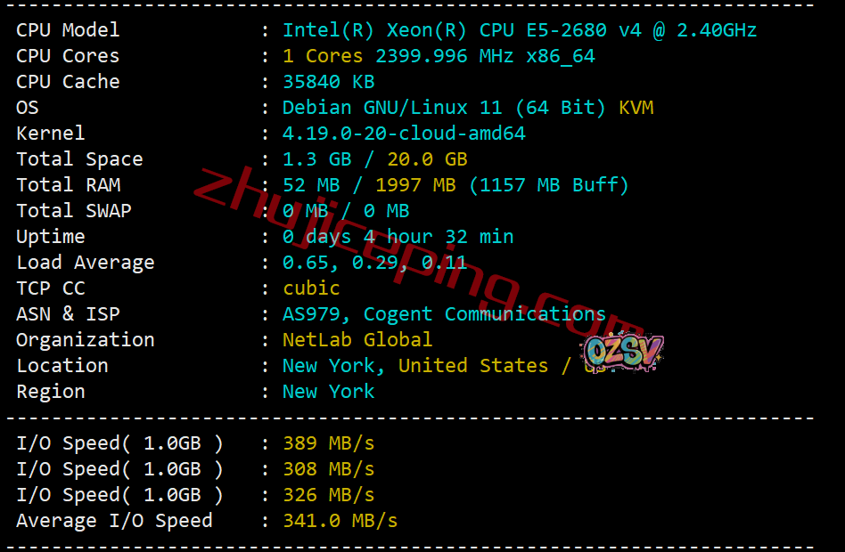CPU默认型号为e5-2680v4(主频2.4GHz,加速频率3.3GHz,双路CPU为28核56线程),cogent的AS号,当前硬盘I/O大致341MB/S的样子: