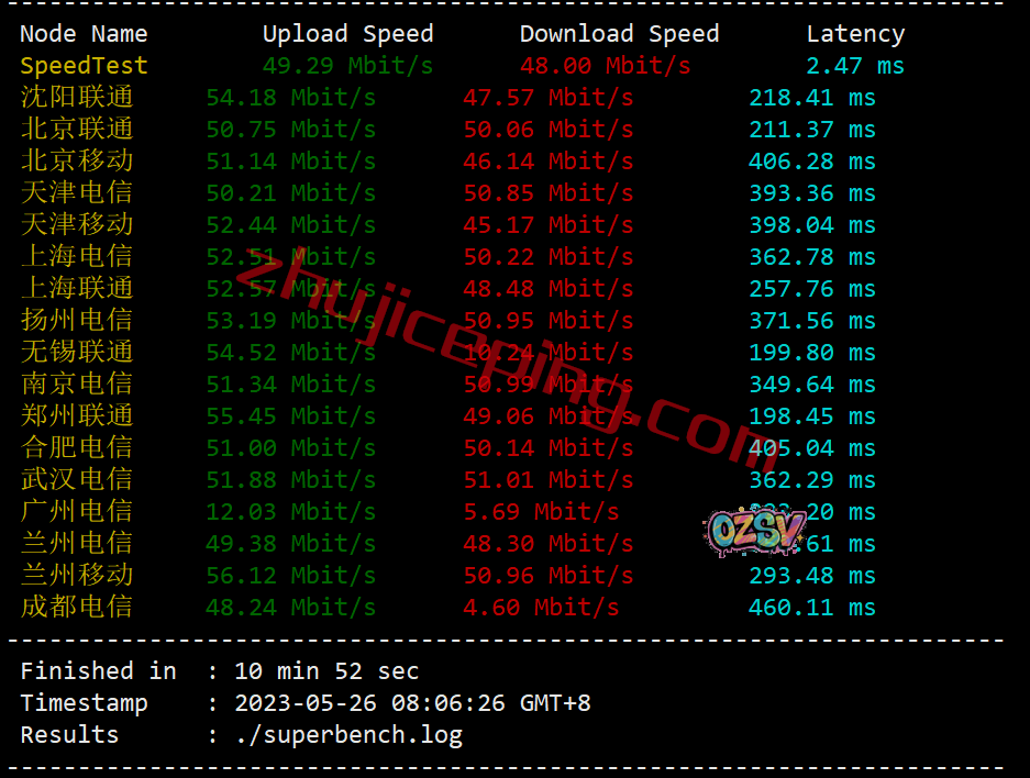 这里测试选择的是最低配,默认50Mbps带宽,我们用speedtest的国内节点来跑一圈看看,大致数据如下: