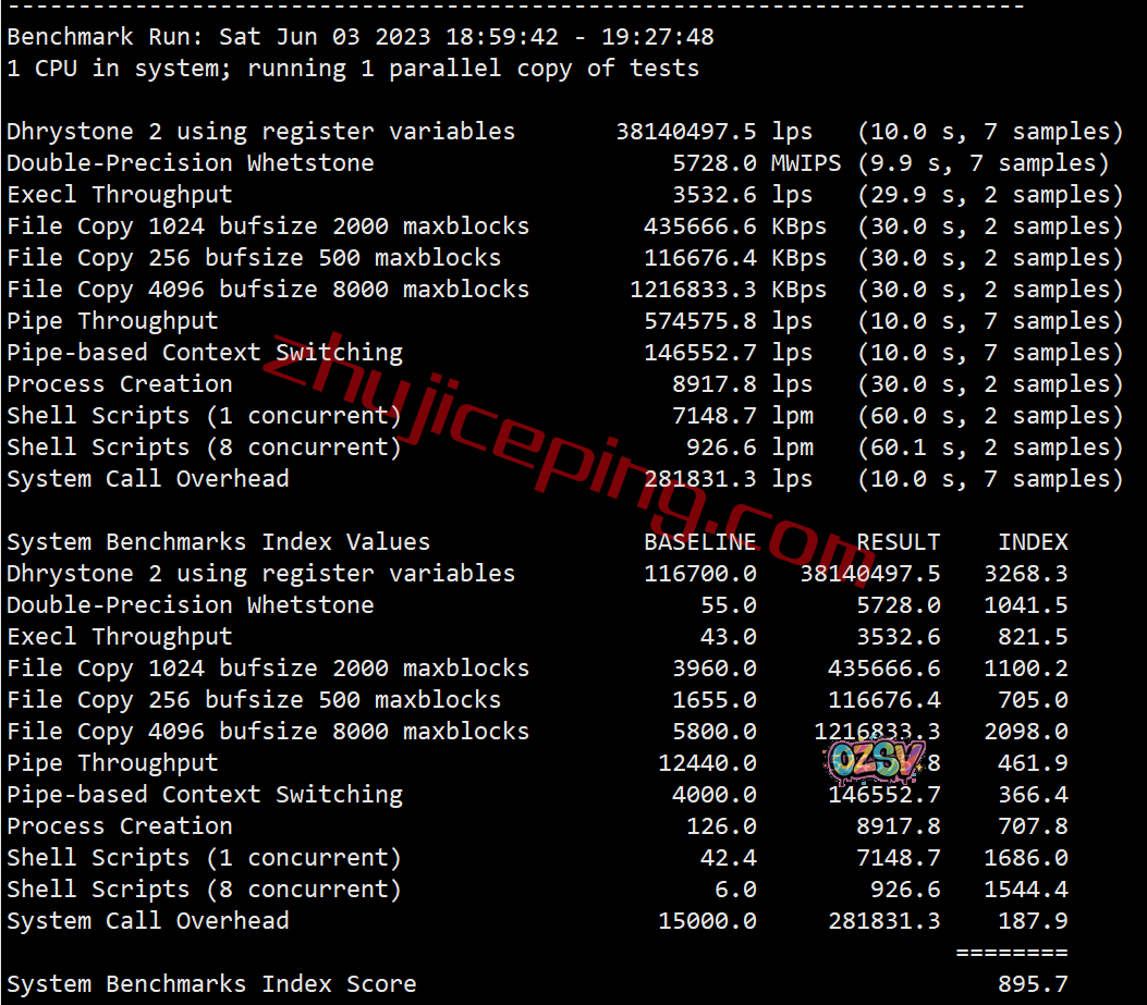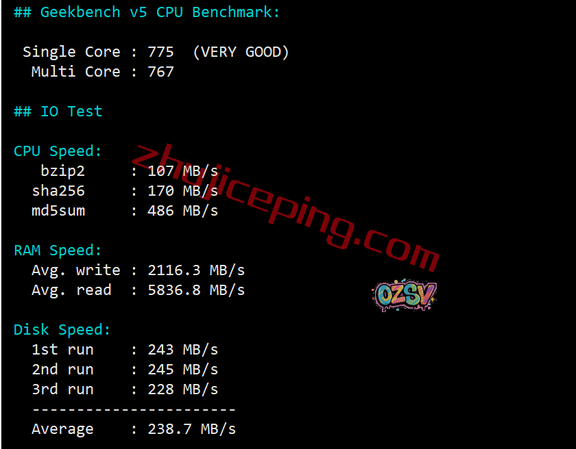 目前服务器的CPU跑分还不错,硬盘I/O可能测试的时间不同效果不一样(最差也有222MB/S);