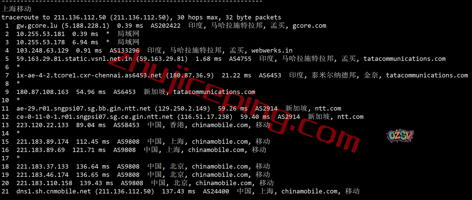 移动去程:走香港CMI后接NTT再转TATA去新加坡、印度