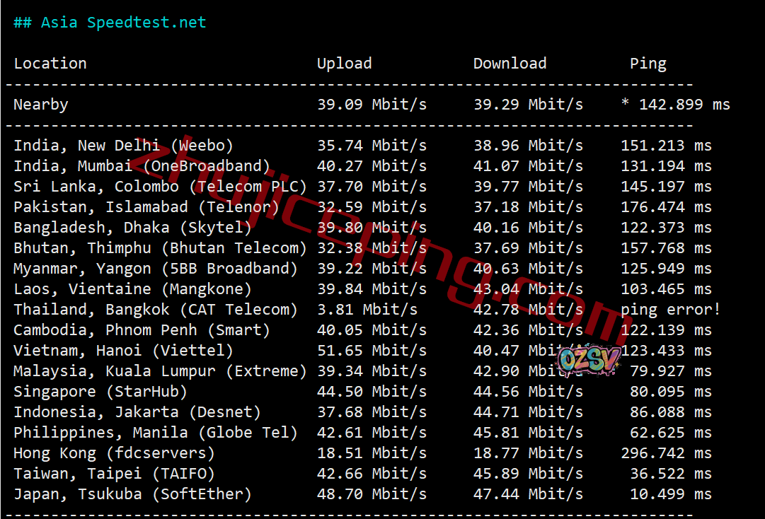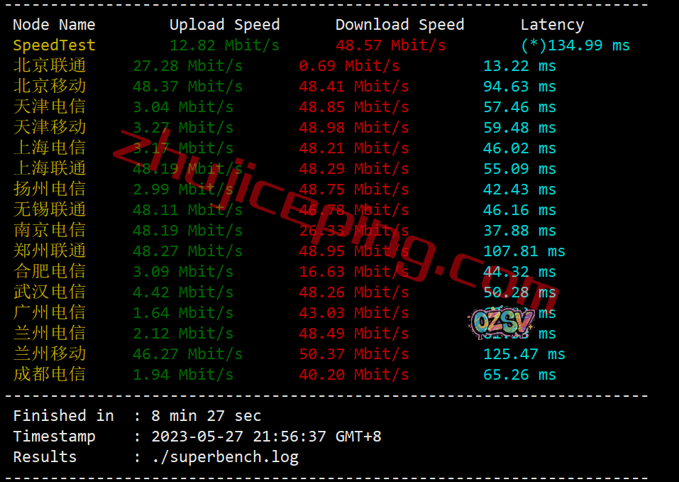 默认50Mbps带宽,国内三网多节点的上下行测试数据: