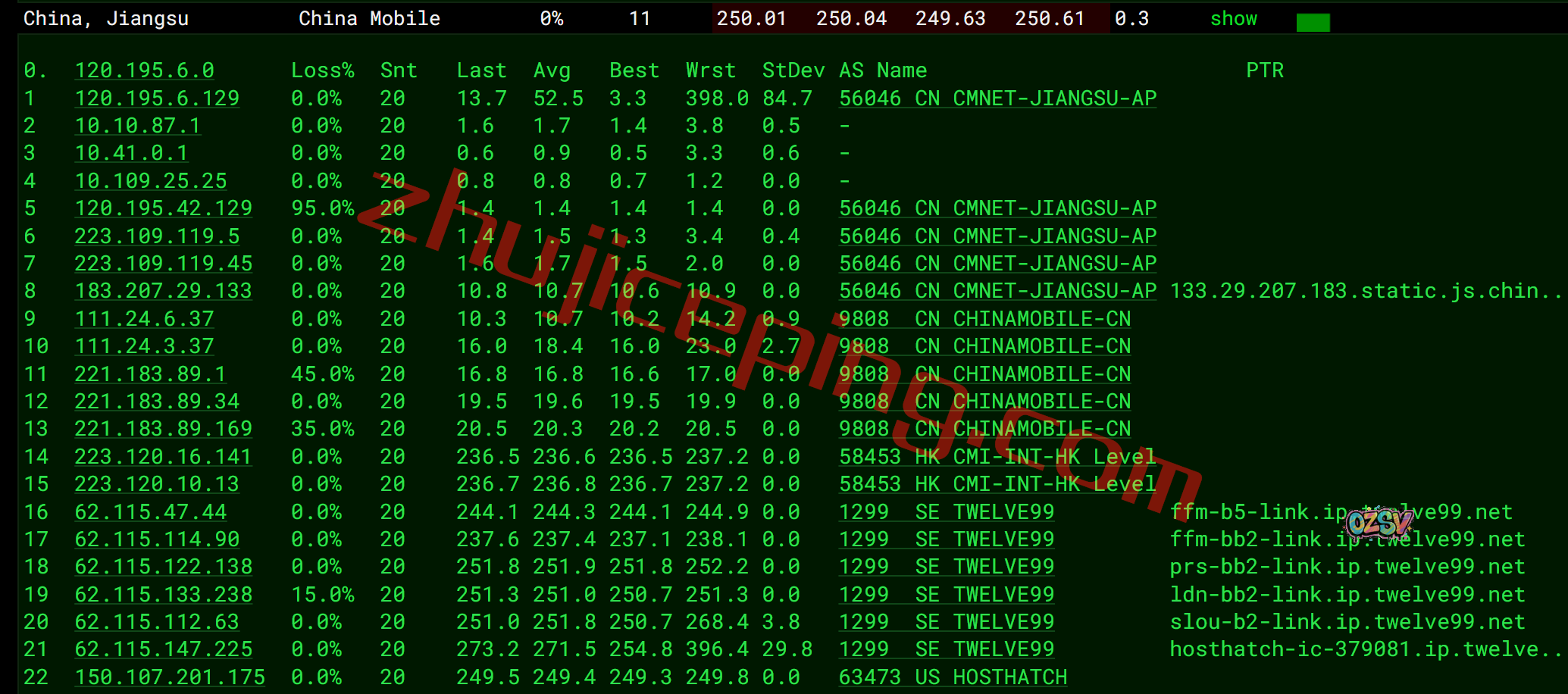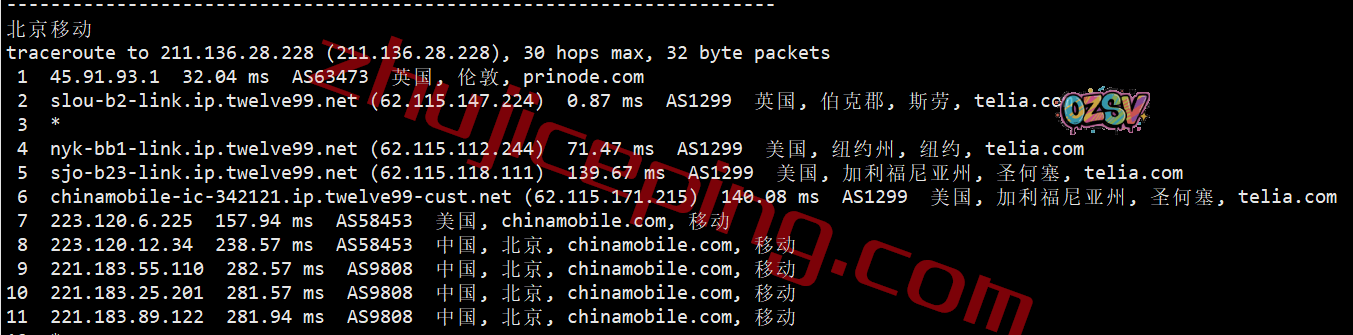移动去程:直连移动德国法兰克福节点然后走twelve99经过法国去英国