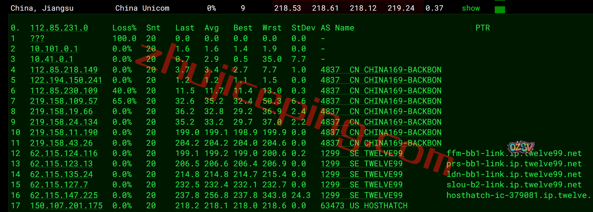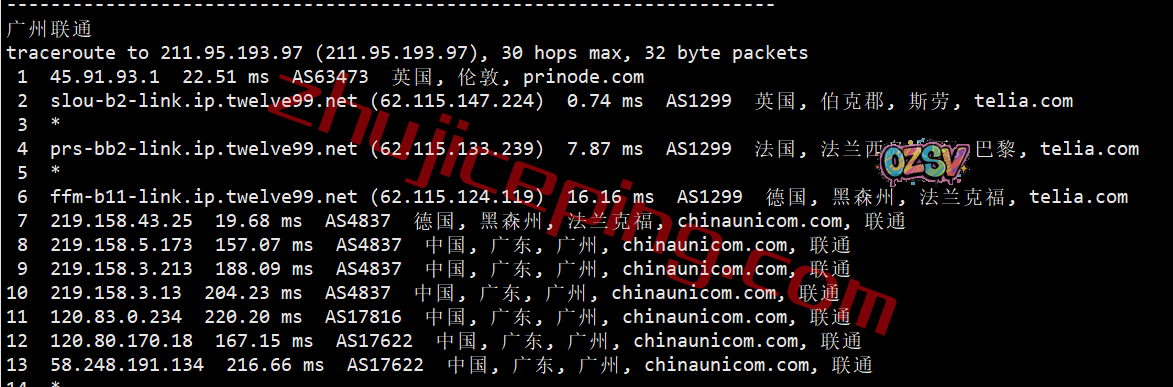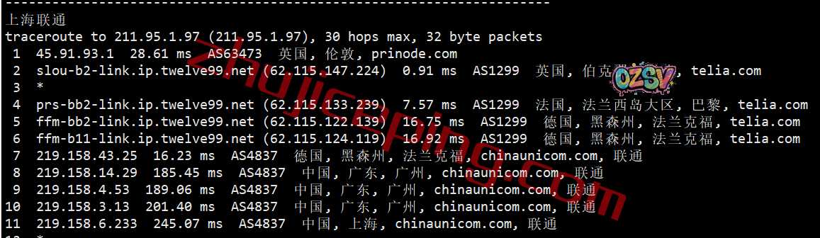 联通回程:走telia到德国,从联通德国法兰克福节点直连回国