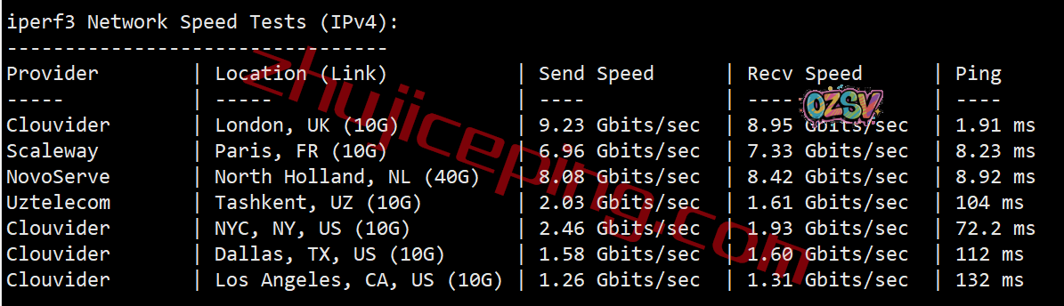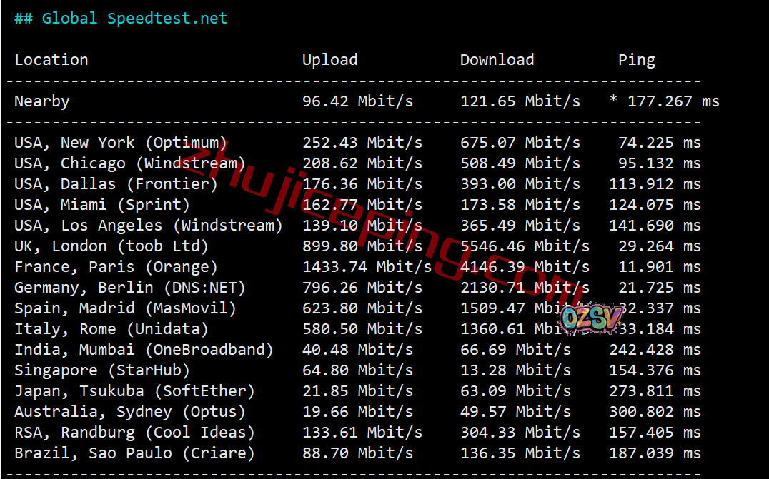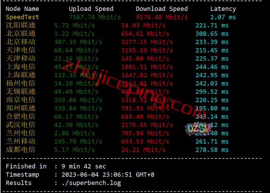 用speedtest在国内的三网节点去跑一下上下行的测试,输出结果大致如下:
