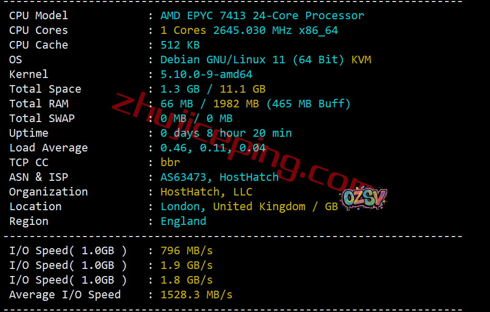 测试用的是最低配,看到CPU型号为AMD EPYC 7413(24核48线程,主频2.65GHz\加速频率3.6GHz),hosthatch自己的AS,归属地是英国,站长启用了BBR,当前硬盘I/O大致在1528MB/S的样子: