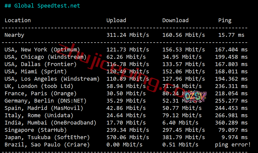 我们用speedtest在国内的三网节点来跑一下看看上下行带宽能到多少,大致数据如下: