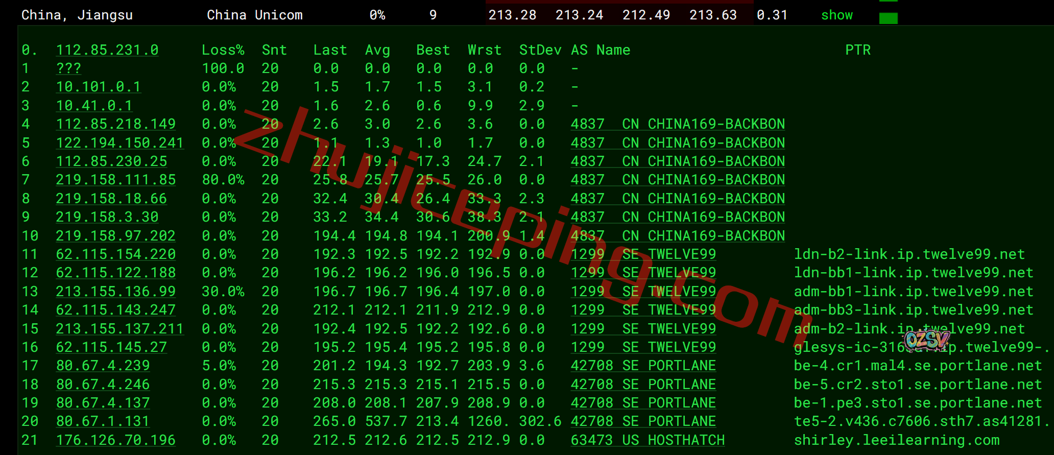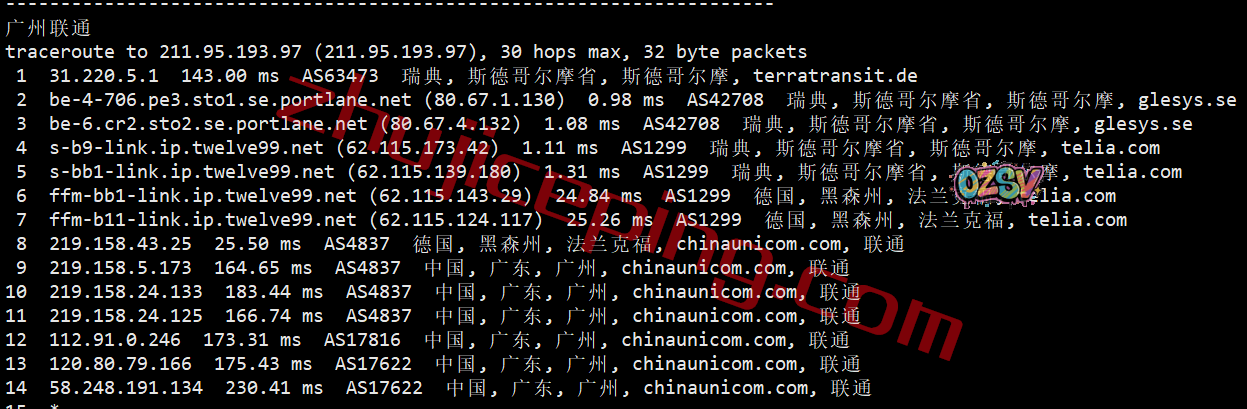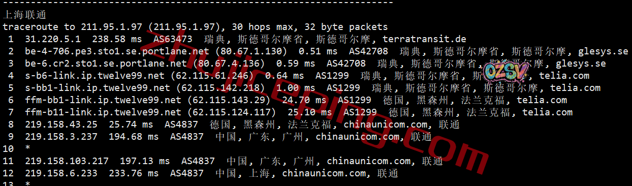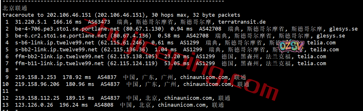 联通去程:直连联通伦敦节点然后走twelve99经过荷兰去瑞典