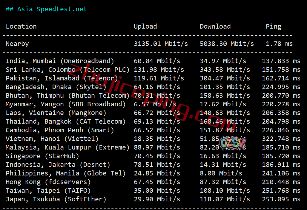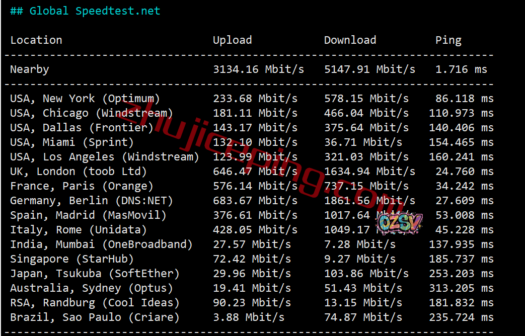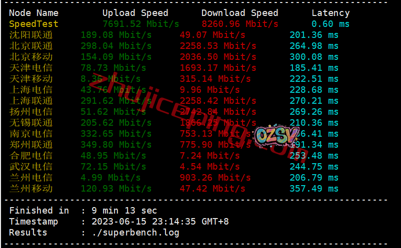speedtest的国内三网多节点测试带宽上下行,大致数据: