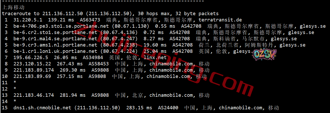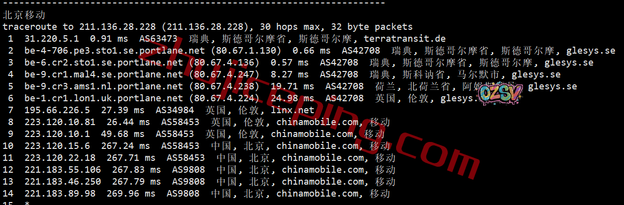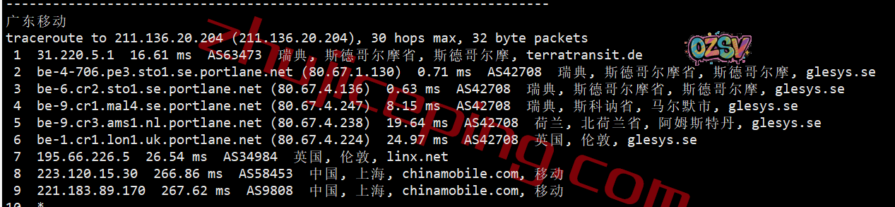 移动去程:直连移动伦敦节点后走portlane经过荷兰去瑞典