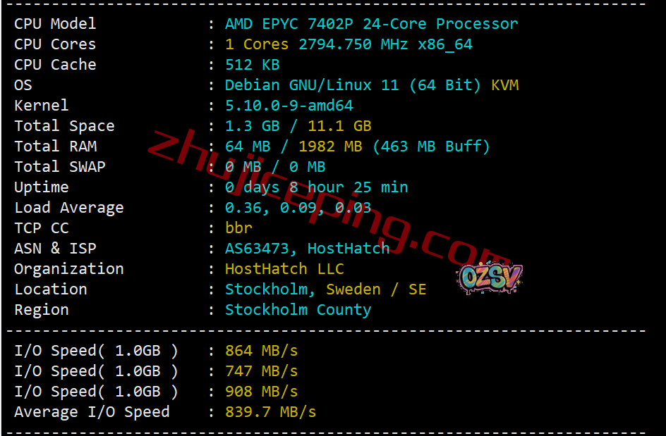 弄了个最低配的,我们看到的CPU型号是AMD EPYC 7402P(24核、48线程、主频2.8GHz、加速频率3.35GHz),启用了BBR,hosthatch自己的AS,归属瑞典,当前硬盘I/O大致839MB/S: