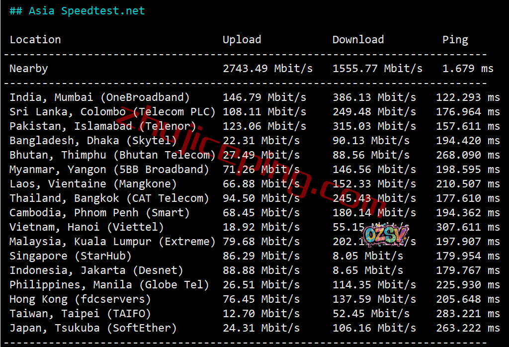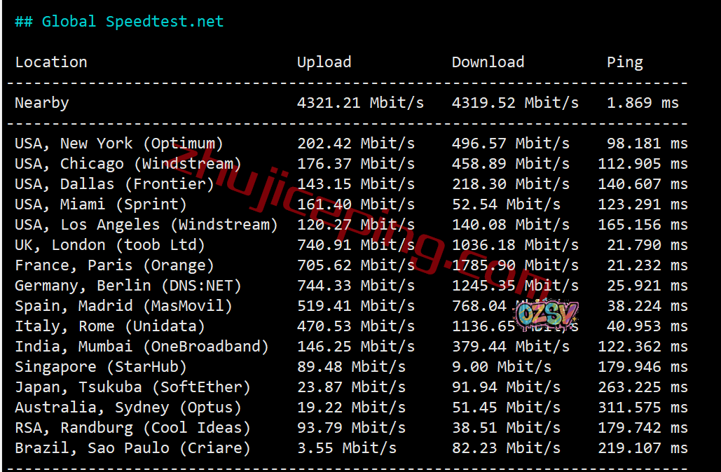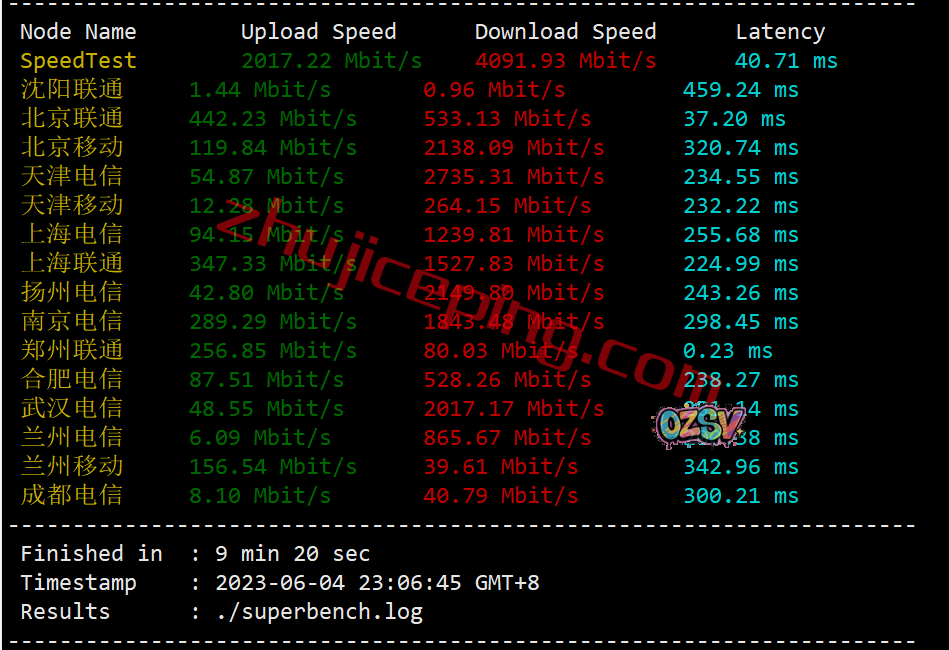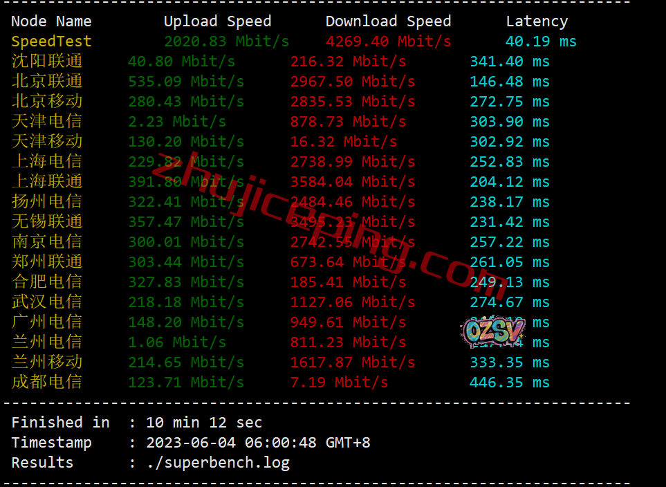 默认10Gbps带宽,我们用speedtest在国内的三网多节点跑一下上下行,看看能在国内冲到多少吧,大致如下: