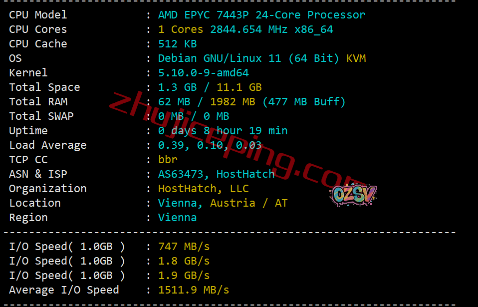 站长发现hosthatch好几个数据的CPU都是AMD EPYC 7443P(24核、48线程、2.85GHz主频、4GHz加速频率)这款CPU,貌似IP归属也在奥地利,启用了BBR,当前硬盘I/O测试大致在1511MB/S左右: