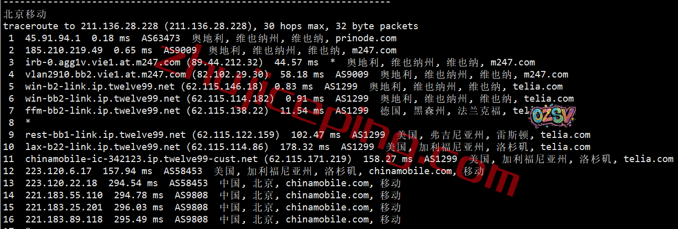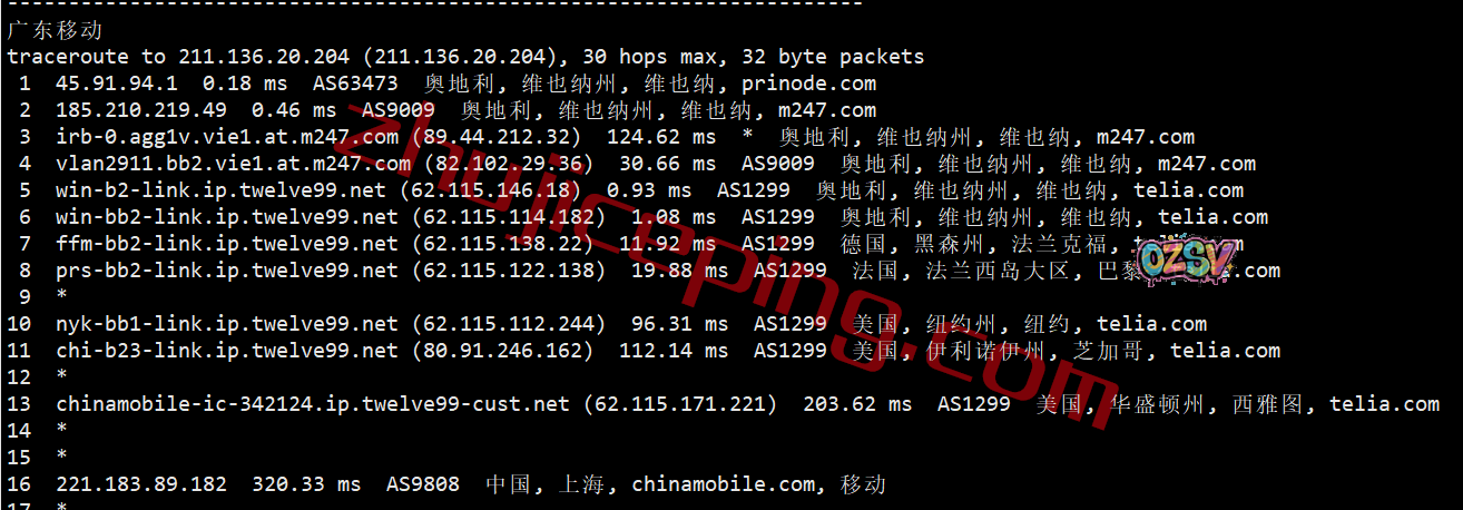 移动去程:先到移动英国伦敦节点然后走cogent经过荷兰、法国等到奥地利