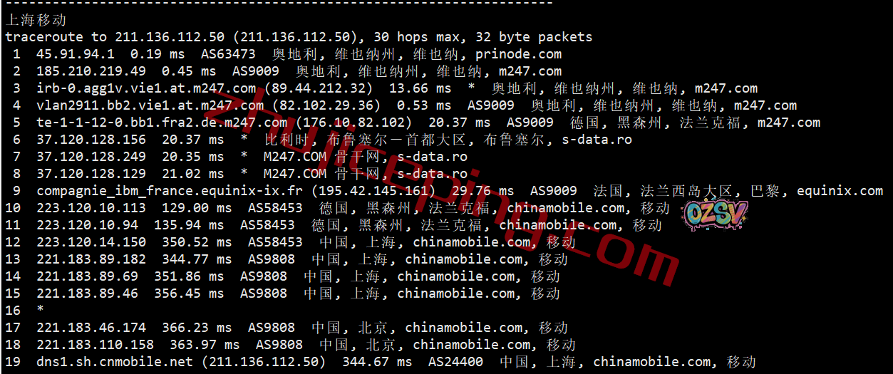 上海方向:走M247经过比利时到法国equinix,然后从移动法兰克福节点直连回国
