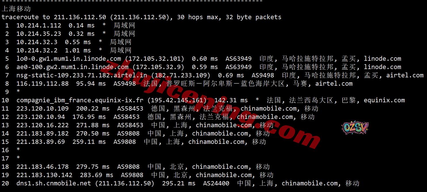 上海方向:走airtel去法国然后转equinix去德国,从移动德国法兰克福节点直连回国