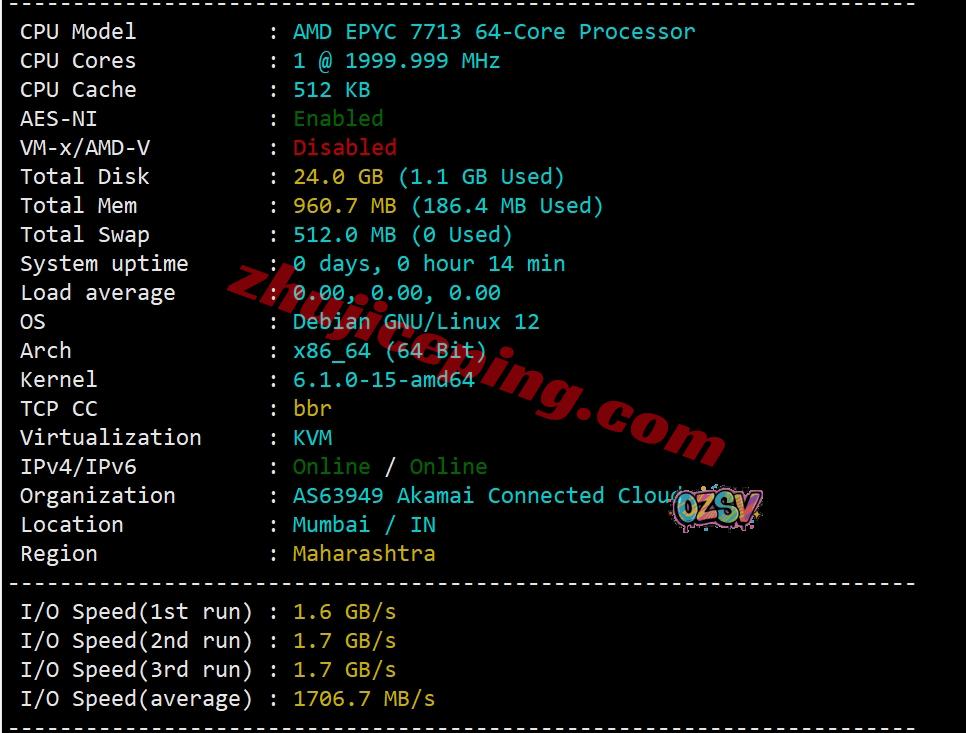 AMD EPYC 7713(64核、128线程、主频2.0GHz、加速频率3.675GHz),站长启用了BBR,支持IPv6,IP归属印度孟买,当前硬盘I/O大致1706MB/S: